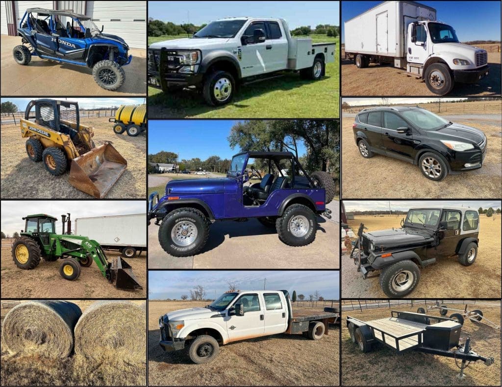 JD Tractor – Vehicles – Pick ups – Swather – Hay – Livestock Trailer – Truck – Freightliner – CAT Generator – Skid Steer – Snowmobile – Honda UTV