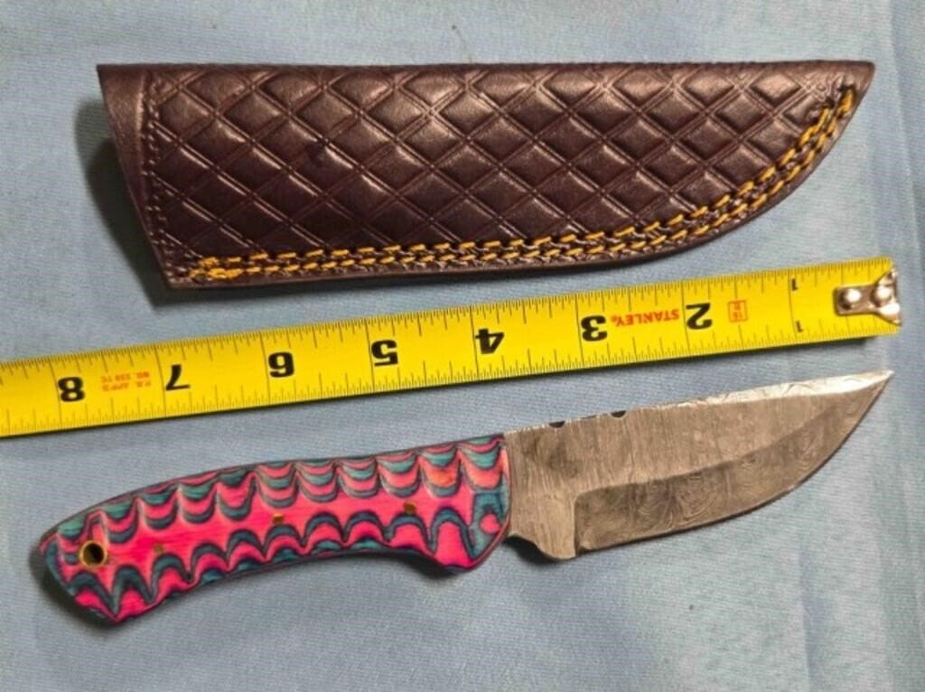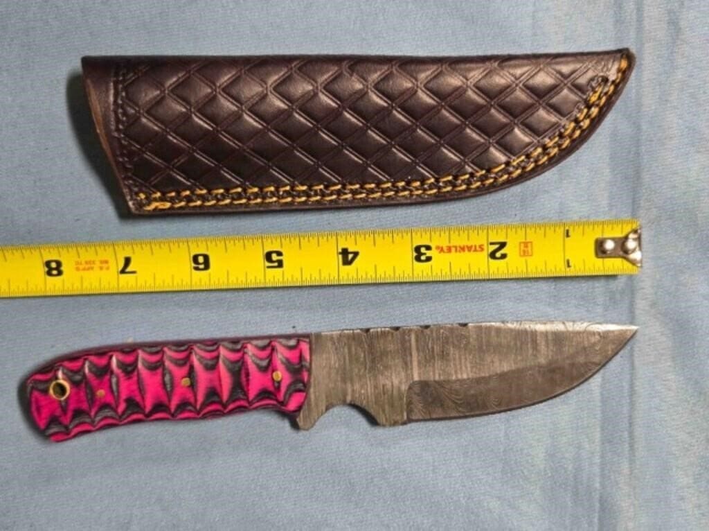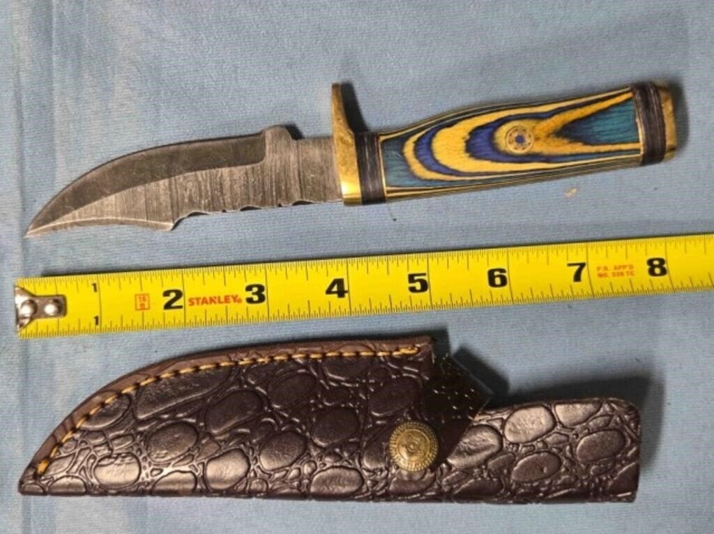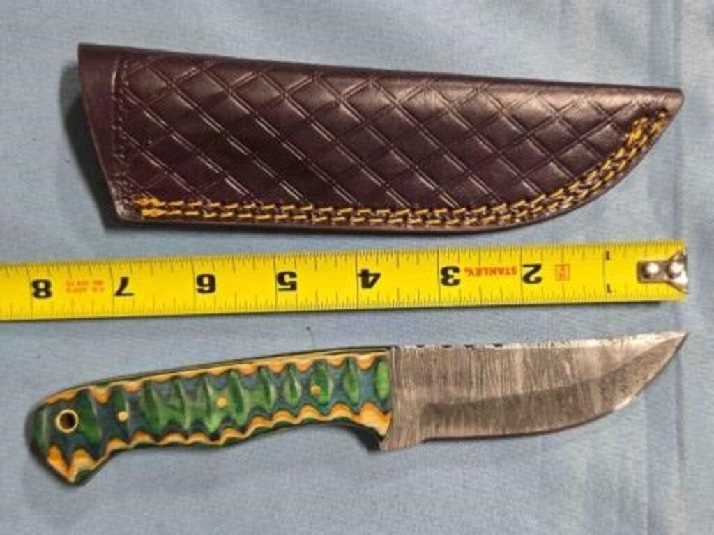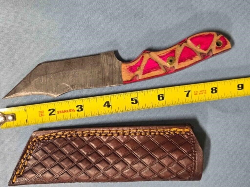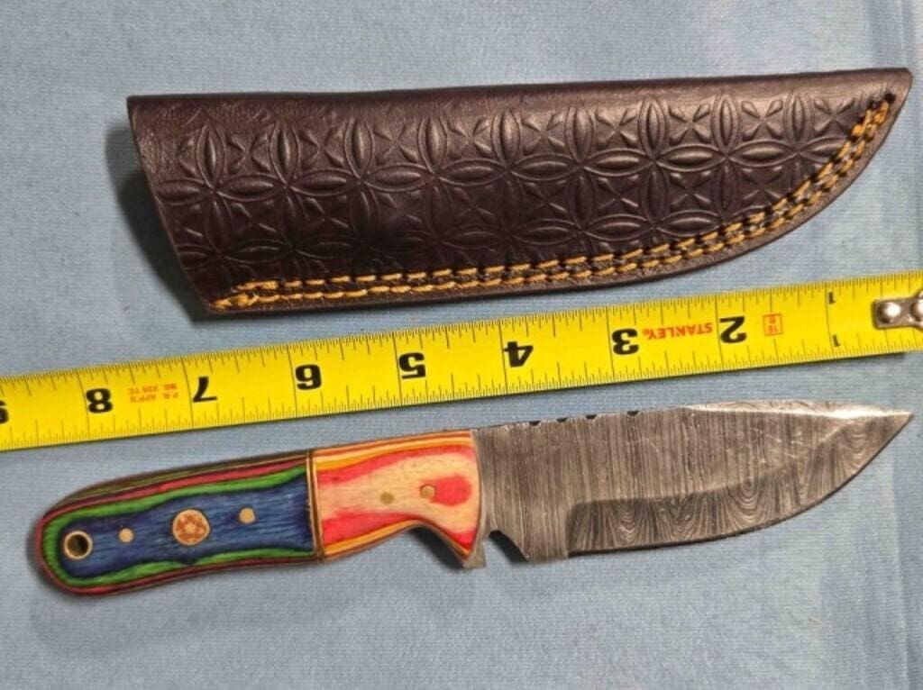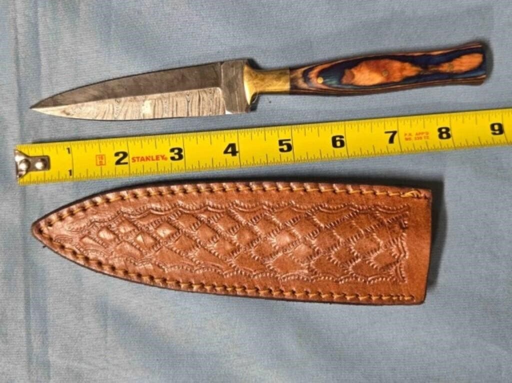 - Drop point blade knife. Damascus steel