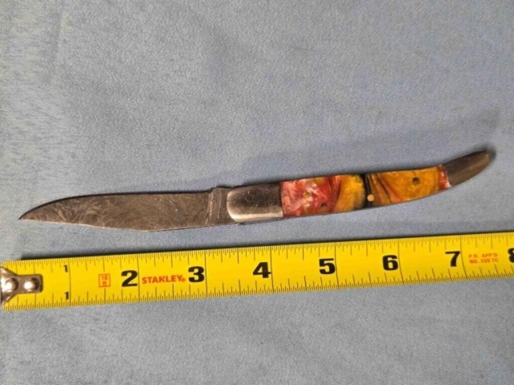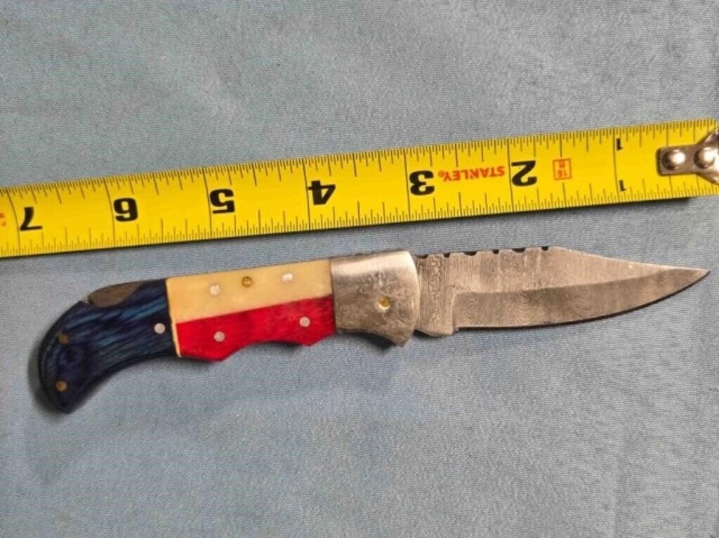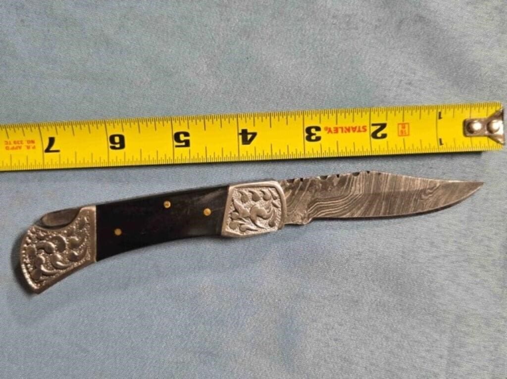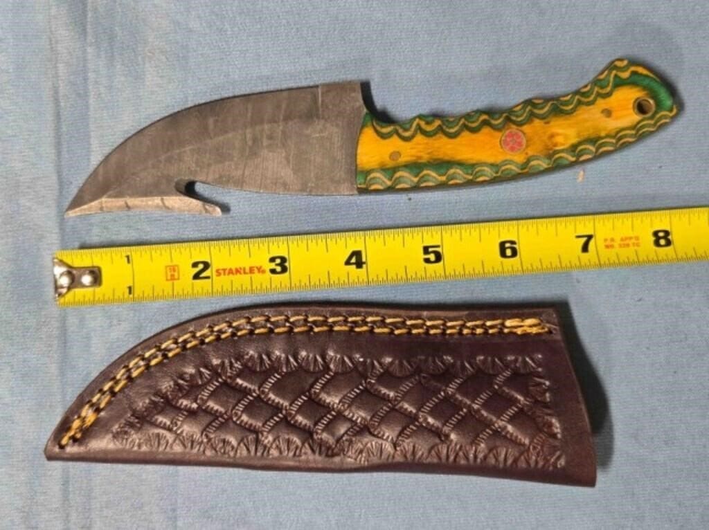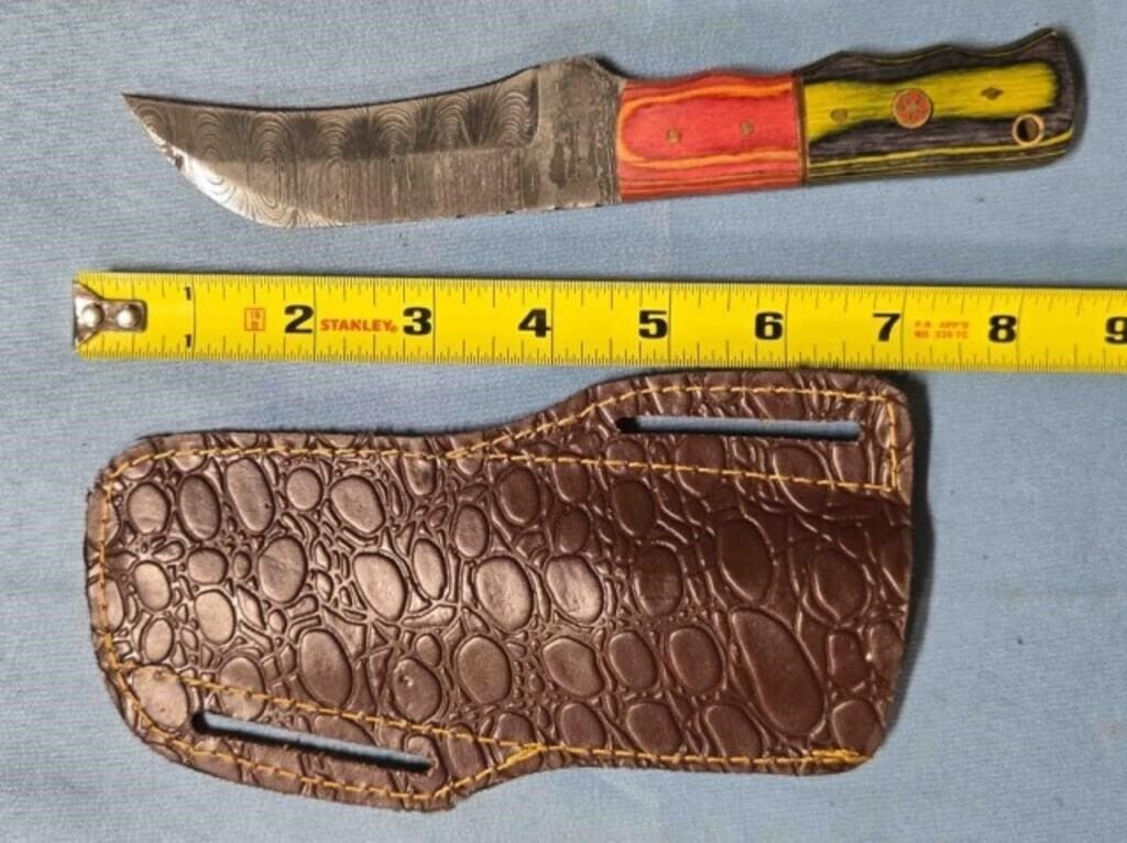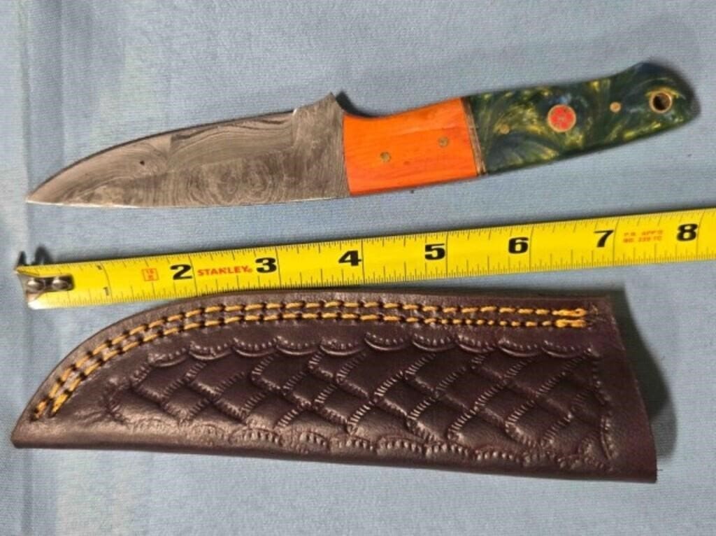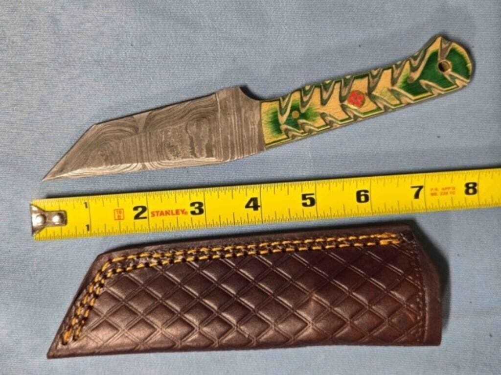 - Drop point blade knife. Damascus steel