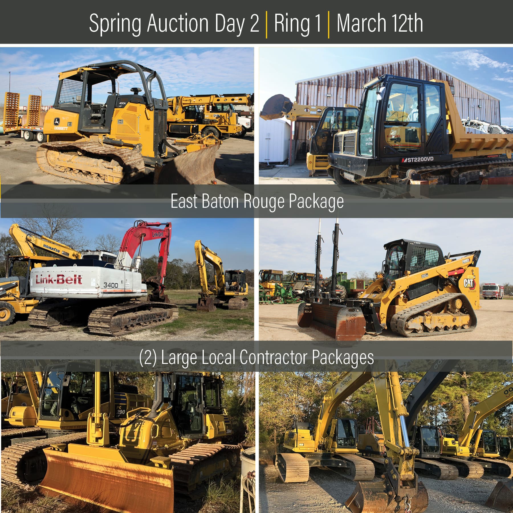 Henderson Auction’s 2-Day Spring Public Auction will be held on March 11th & 12th, with lots starting to close at 10am CT. Day 2 | Ring 1 – Selling Dozers, Excavators, Cranes, Asphalt Equipment, Lifting Equipment, Water Trucks, Skidsteers, Earth Movers, Backhoes, Attachments, Industrial, Government Surplus Package, and More.