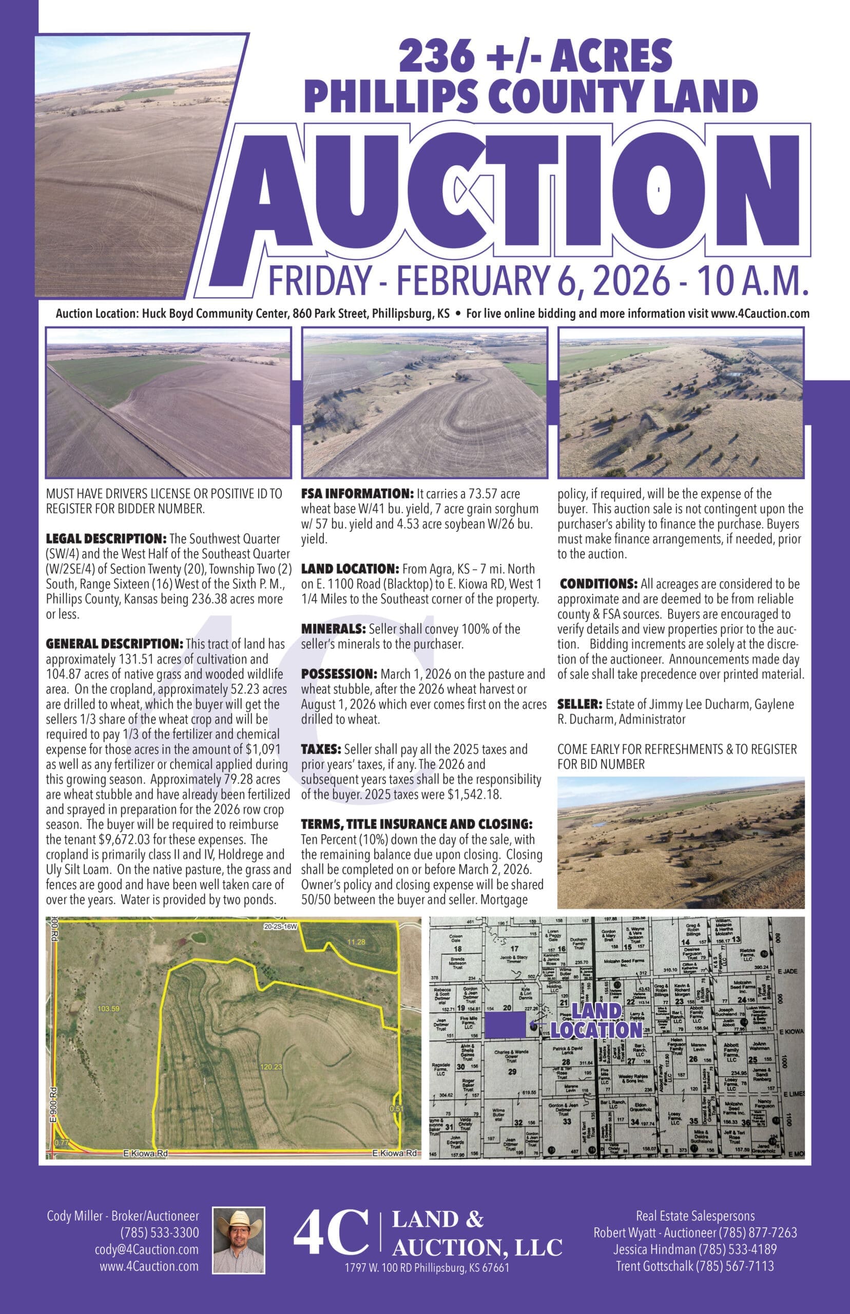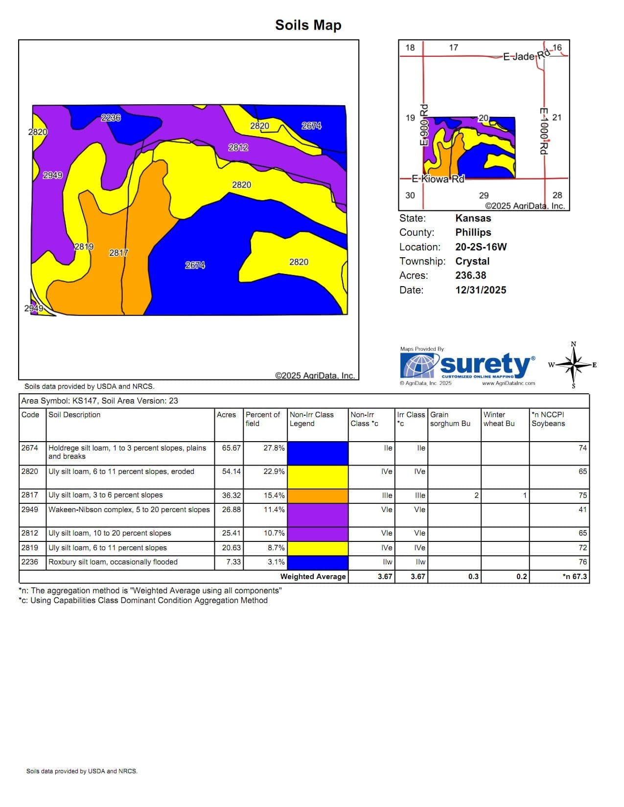 GENERAL DESCRIPTION: This tract of land has approximately 131.51 acres of cultivation and 104.87 acres of native grass and wooded wildlife area. On the cropland, approximately 52.23 acres are drilled to wheat, which the buyer will get the sellers 1/3 share of the wheat crop and will be required to pay 1/3 of the fertilizer and chemical expense for those acres in the amount of $1,091 as well as any fertilizer or chemical applied during this growing season. Approximately 79.28 acres are wheat stubble and have already been fertilized and sprayed in preparation for the 2026 row crop season. The buyer will be required to reimburse the tenant $9,672.03 for these expenses. The cropland is primarily class II and IV, Holdrege and Uly Silt Loam. On the native pasture, the grass and fences are good and have been well taken care of over the years. Water is provided by two ponds.