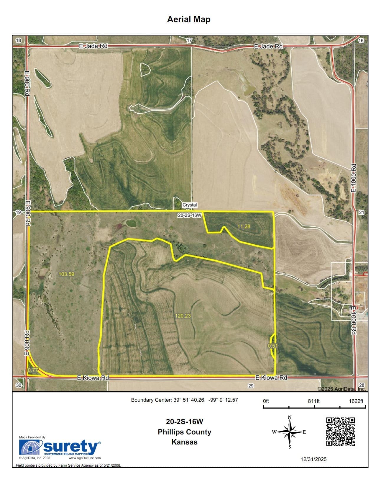 LAND LOCATION: From Agra, KS – 7 mi. North on E. 1100 Road (Blacktop) to E. Kiowa RD, West 1 1/4 Miles to the Southeast corner of the property.