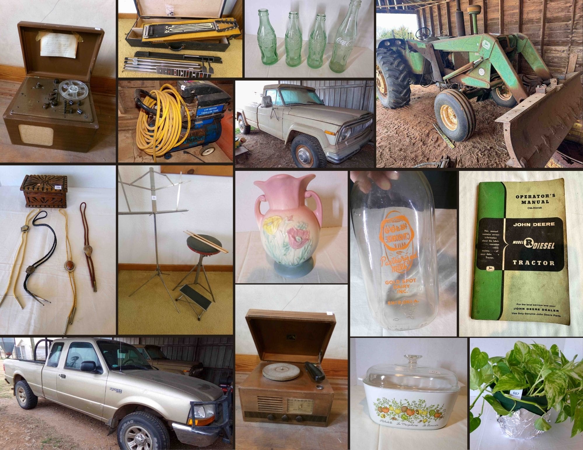 JD Tractor – Ford Ranger – Jeep Pickup – Shop Tools – Miller Steel Guitar & Books – Corning Ware Spice O Life – Canning Jara – German Haemonica – Oil Lamps – Vintage Beds – Enid Coca Cola Bottles – Gold Spot Bottles – RCA Victrola & Records