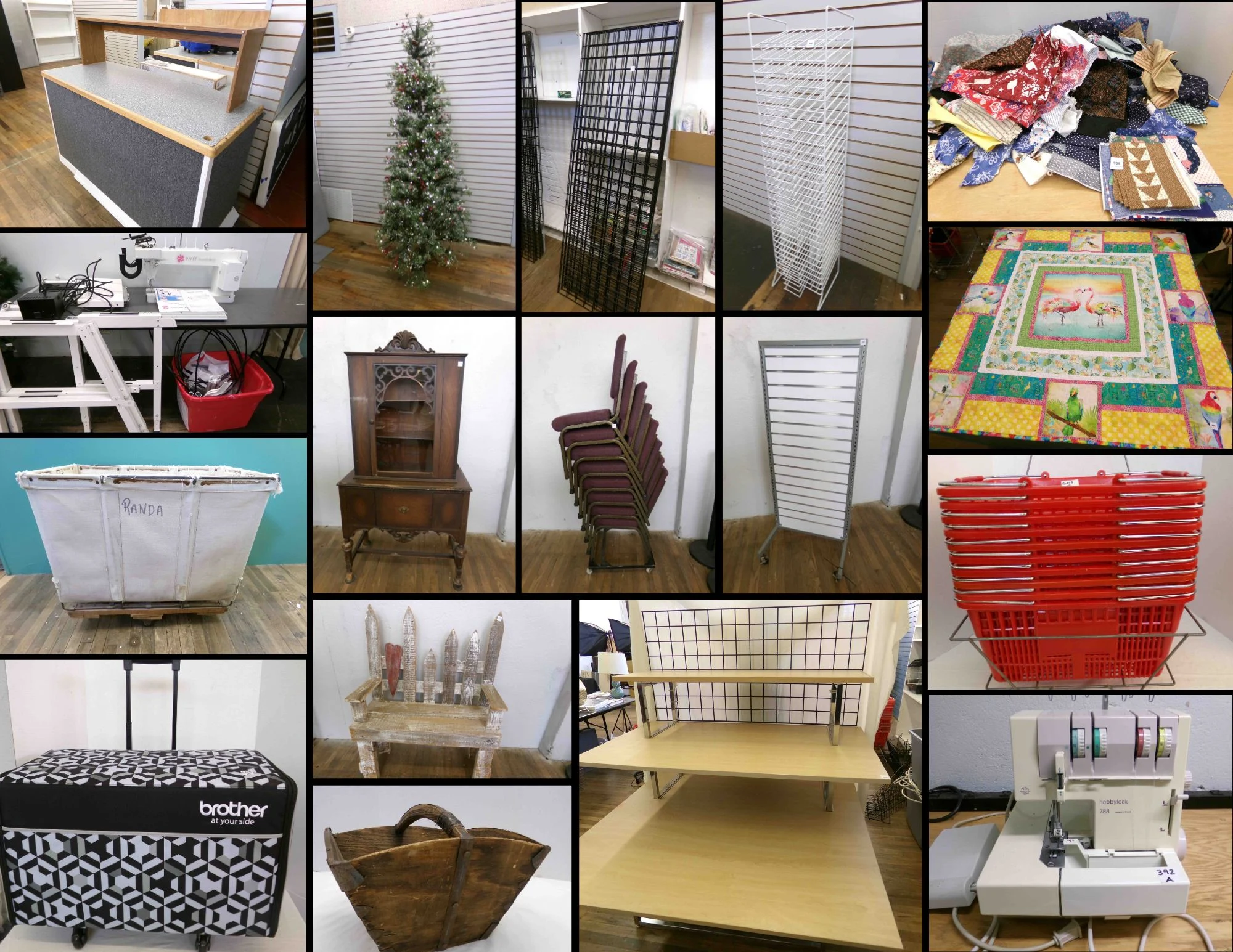Office Building /Retail Store Supplies And Fixtures – Furniture – Displays – Tools -Quilting Machines And Sewing Chairs- Fabric Bundles-Boutique Items-Accessories And Displays- Antiques