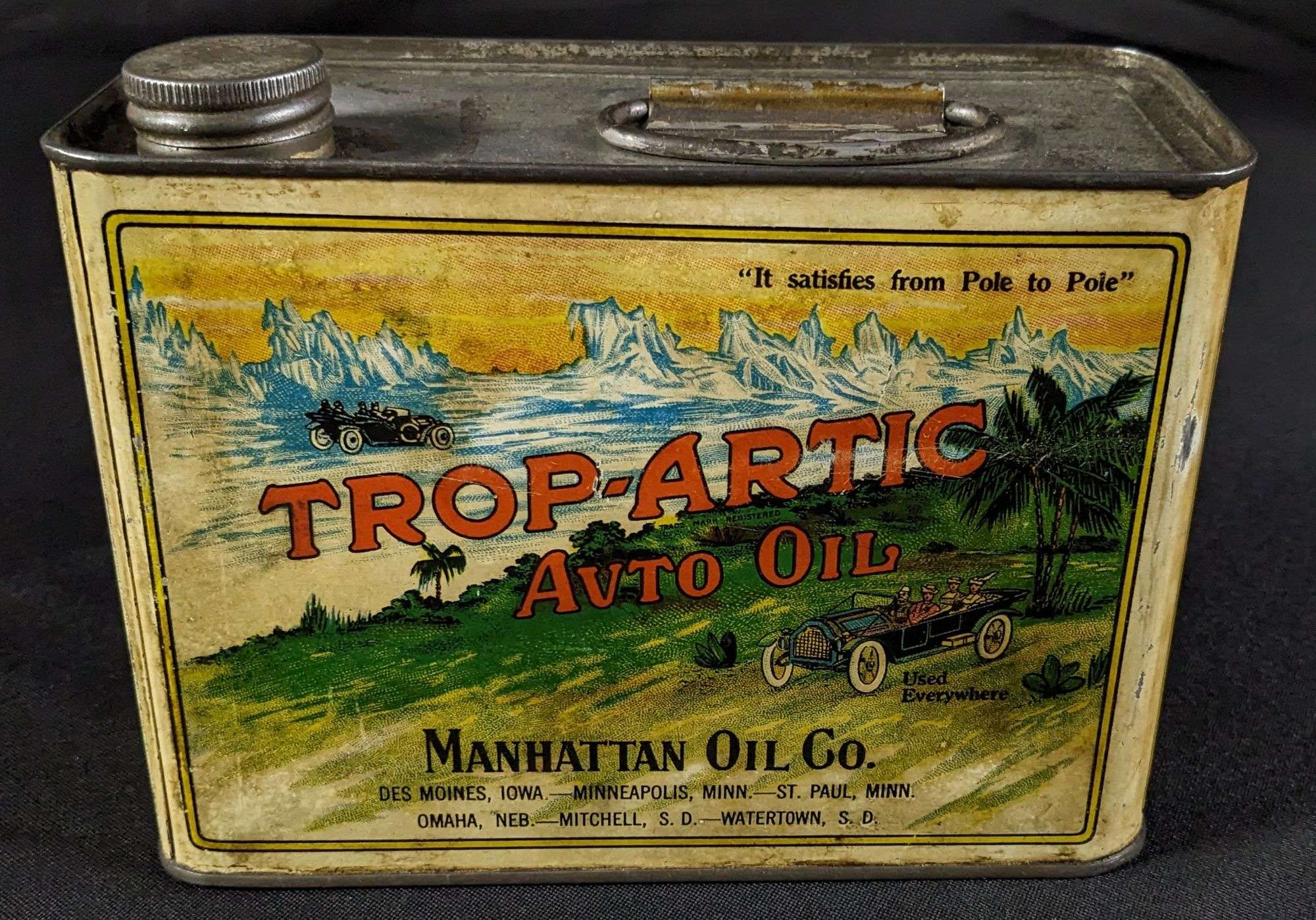 - 1/2 GAL OIL CAN TROP-ARTIC MANHATTAN OIL CO DES MOINES MINNEAPOLIS ST PAUL OMAHA MITCHELL WATERTOWN