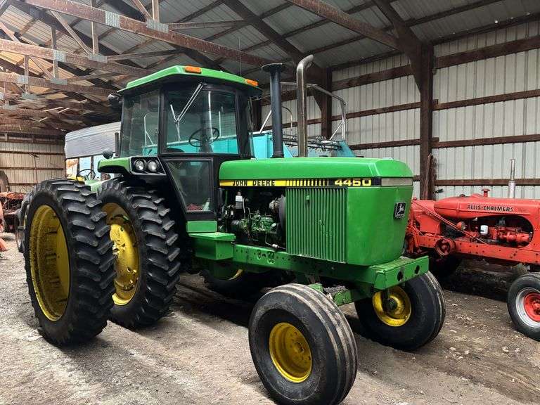 John Deere 4450 diesel tractor cab, heat & air, wide front, 2566 hours, 3 pt, Quick Hitch, power shift 15 speed, 540/1000 PTO, 14.9×46 good rear rubber, hub duals,