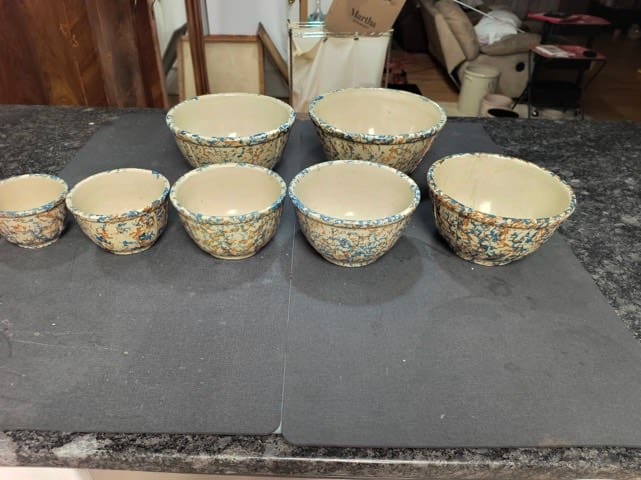 Red Wing 5, 6, 7, 8, 9, 10, 11 spongeware paneled bowls (6” Otto A. Bade Hardwares Lake Mills, Wis., & 7” Jesup, Iowa)