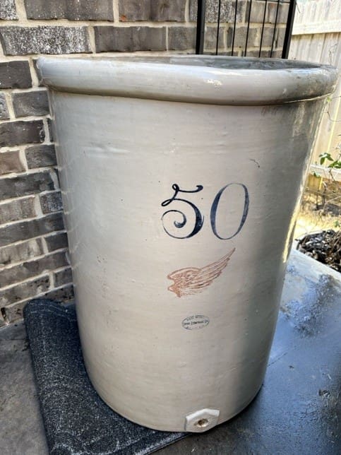 50 Gal. crock w/ hexagon drain (has hairline in back);
