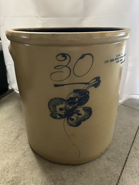 30 Gal. crock w/ butterfly design, double stamped w/ blue ink stamp on front top side & embossed stamp on back bottom side, turkey dropping on back, salt glazed inside & elephant ears (Very rare, it does have a crack in the back);