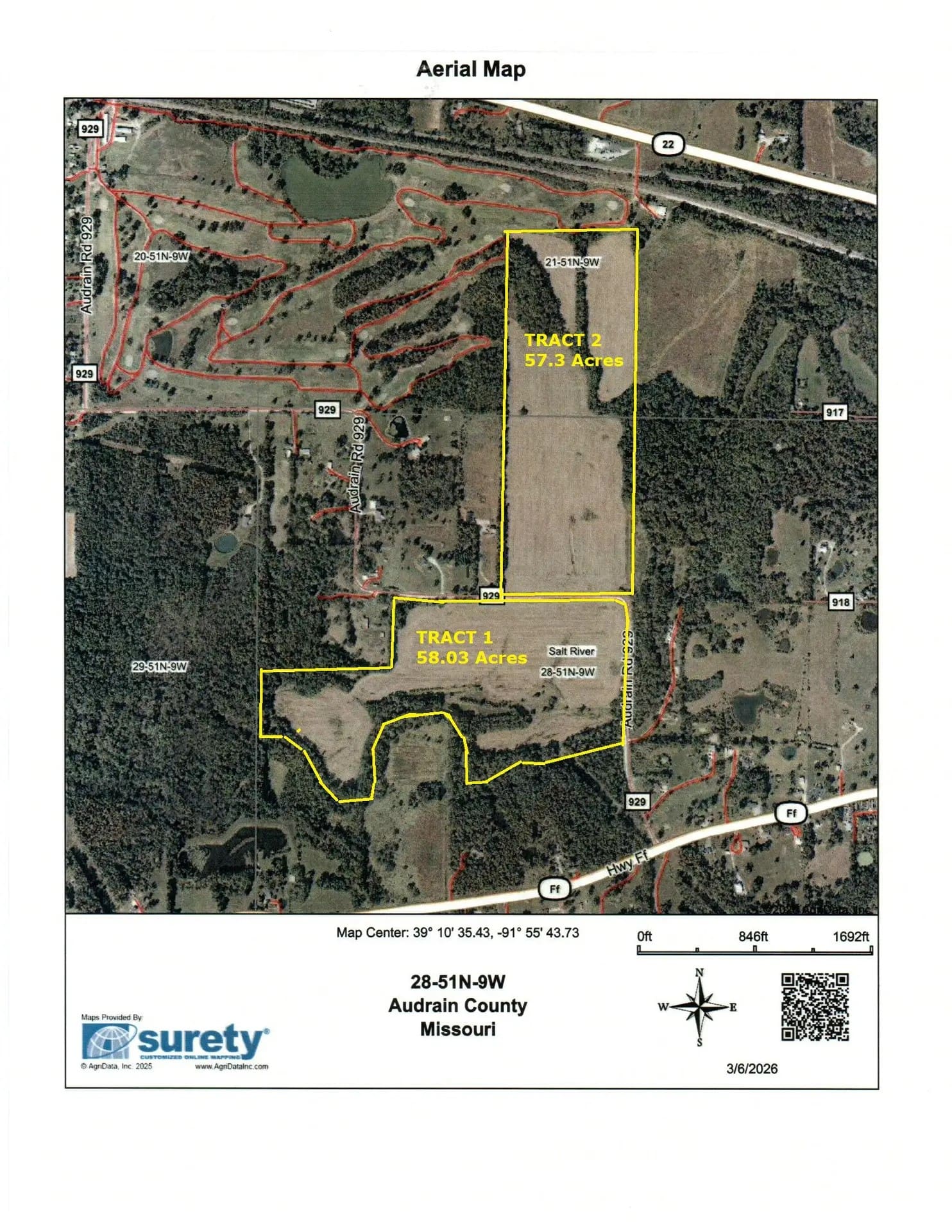 Consists of 57.3 +/- acres that lie north of ACR 929 with frontage and access along the south side of the tract from ACR 929. The Audrain County FSA Office calls for 46.69 acres of cropland that is currently in row crop production with the balance in woods and wooded draws. There is rural water along Audrain County Road 929.