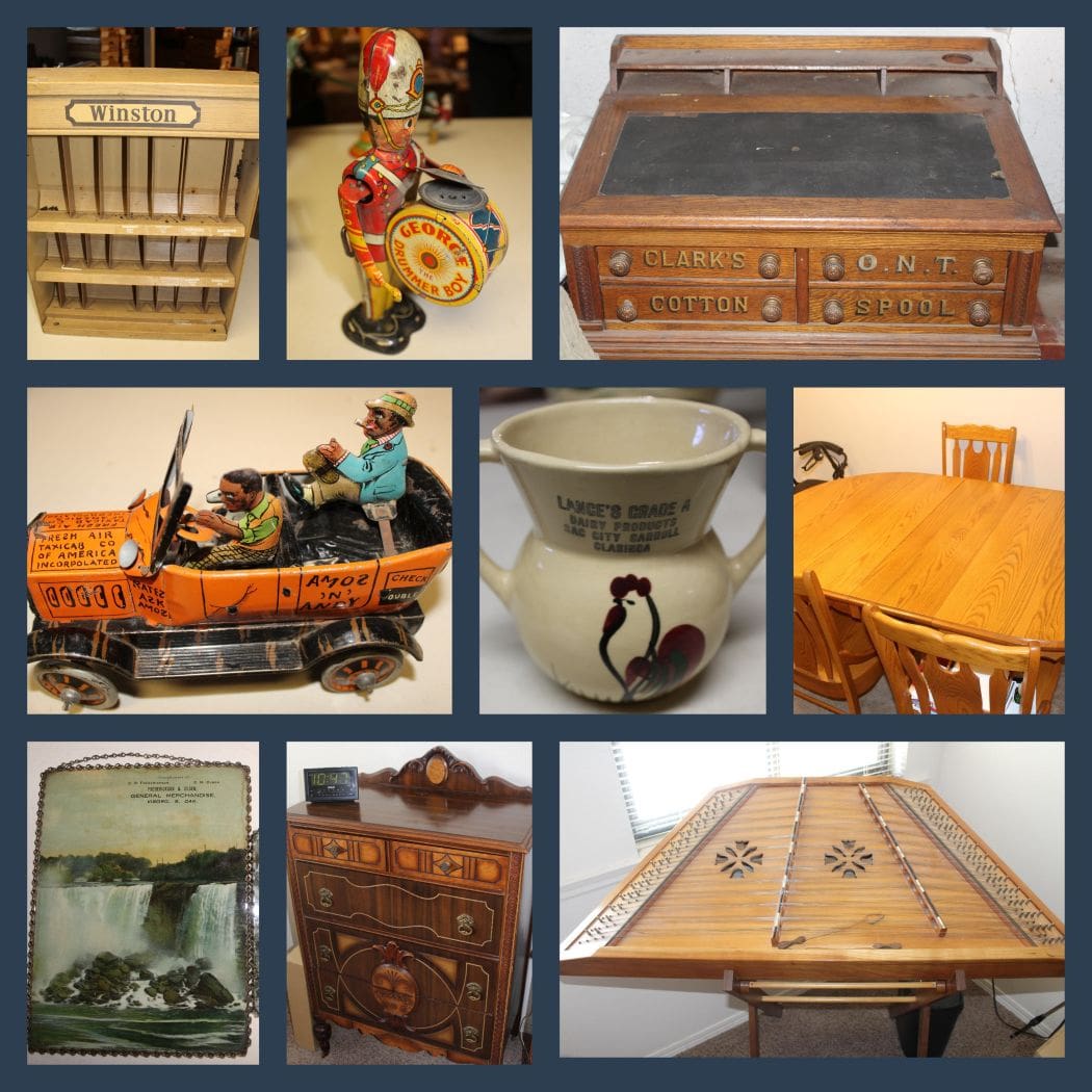 Antiques & Collectibles With a Large Selection of Advertising Pieces!! Furniture, Stoneware, Tin, Cast & Wind-Up Toys, Sterling Silver Spoons, Glassware, Coins & Paper Currency, Household & More!!