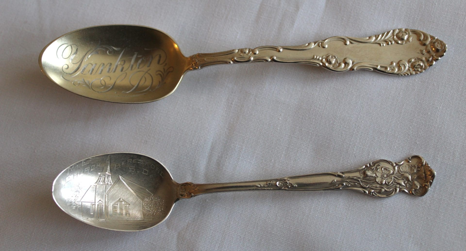 STERLING SILVER SPOONS W/ADVERTISING: Tyndall SD., Yankton SD., Beresford M. E. Church SD., New Dormitory Springfield, High School Centerville SD., Wagner SD., Sioux Falls SD., Avon SD., Viborg SD., High School Parker SD., Corn Palace Mitchell SD., State Capital Pierre SD., Volin SD., Scotland SD., Wakonda SD., Yellowstone Park;