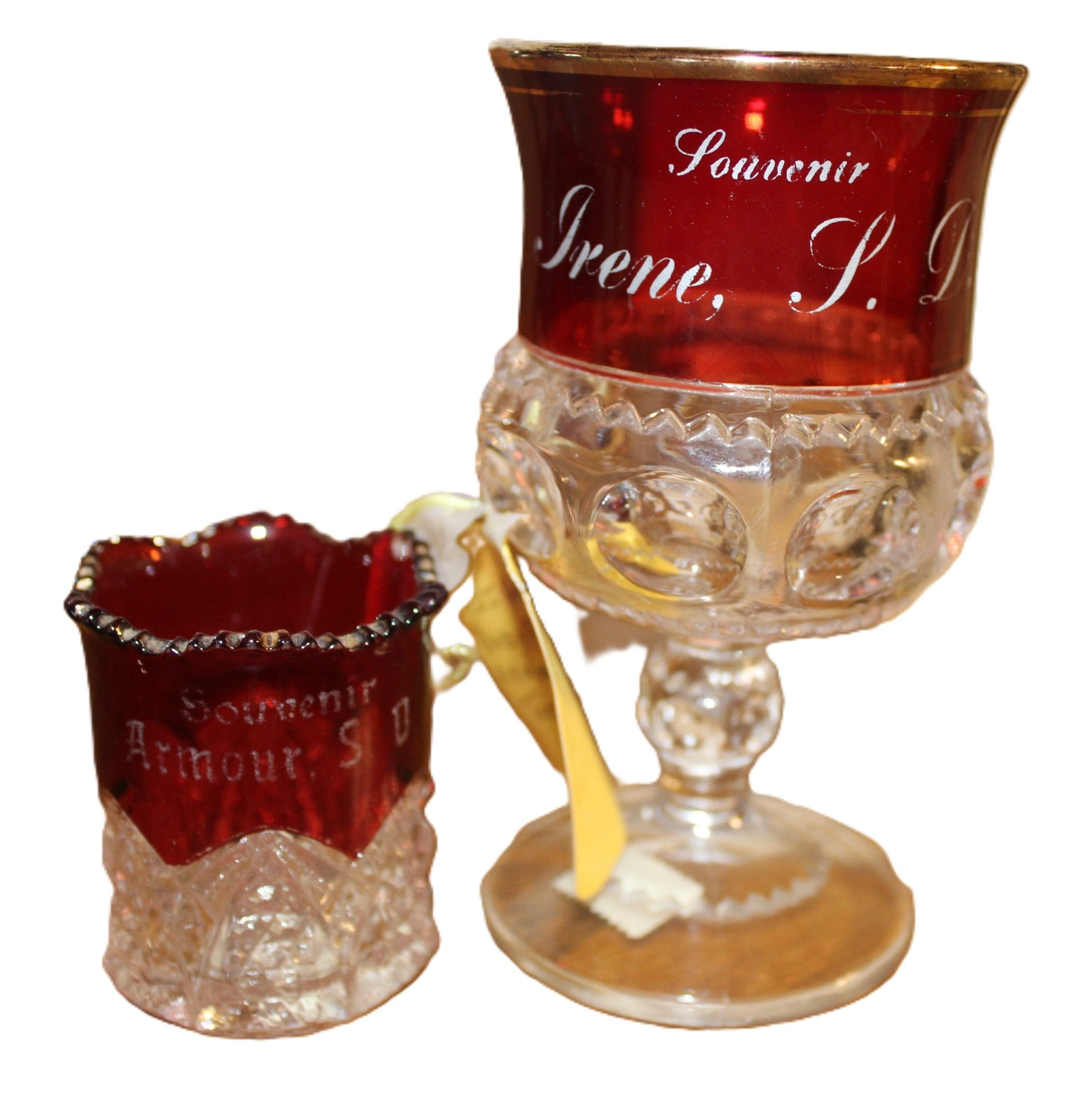 RUBY FLASH, CUSTARD, & MISC GLASSWARE & MISC: Ruby Flash w/SD Adv.-Wakonda, Irene, Armour, Freeman, Vermillion, Lennox, Volin; Custard Glass w/SD Towns-Utica, Mitchell, Parkston, Lennox, Springfield, Gettysburg, Canastota, Vermillion, Greenville; Cosmos Butter Dish, Lamp, Syrup Disp.; Lg. Asst. of Pink & Green Depression; Navy Blue Depr. Pitcher & Tumblers; Lg. Asst. Carnival Glass, Pink Miss America Fostoria, Plates, Bowls, etc.; Bavarian Glassware; Green Clover Leaf Dishes; Fire king Bowl; 1 Gal. Red Wing Crock; #3 Redwing Lid; Rosemead S&P – Turkeys & Pheasants; Buffalo; Hummel Figurines; Num. Household Items, Kitchenware & More!