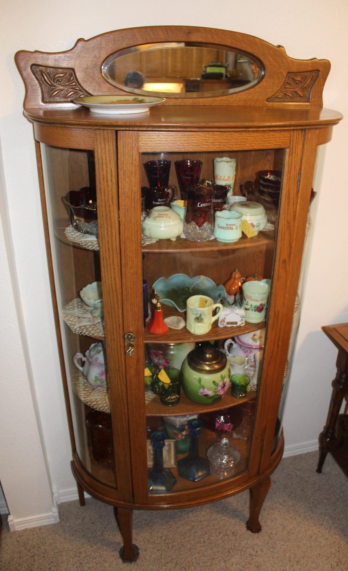 ANTIQUES, ADVERTISING, & COLLECTIBLES: Furniture – 4 Dwr. Clarks Spool Cab.; Oak Curved Glass Buffet w/Mirror; Rd. Oak Clawed Ft. Parlor Table; Oak Parlor Table. w/ Clover Shaped Top & Glass Ball Clawed Ft; Rd. Oak Clawed Ft. Parlor Table.; Curved Glass China Cab.; Oak Dbl. Door China Cab.; Small Oak China Cab. w/Curved Glass; 3 Pc. Wicker Set – 2 Chairs & Table; Cedar Chest; Oak Twin Sz. Headboard & Frame; Wdn. Trunk w/Tray; Floor Length Carnival Mirror; 3 Pink Kerosene Lamps; Pink Oil Lamps; Oak Mantle Clock; Red Coffee Grinder w/Jar; ADVERTISING: Winston & Marlboro Tin Cig. Display Cabinet; Lg. Asst. Adv. Small Pocket Knives; Dekalb Tin License Plate Holder; Round Metal Frank Willers Livestock Gestation Computer; Delavel Match Holder; WNAX Neighbor Lady Cookbooks; 1922 Norw. American Line Cruise Ship Calendar; 1949 Les William Chevy Co. Tripp SD; 1946 Victory Calendar, WNAX Common Sense Cookbook, Rhian Oil 1939 Goodrich Almanac, Sioux City Livestock Notebooks; Skelly Grease Master Encyclopedia; Wood Thermometer Farmers Co-op Cream Station, Watch Fobs; Gold Dust Washing Powder Box; Hammer Sd.; Farmers Pocket Ledgers – 4 Panek Sales Service Howard, SD, 2 Madison Impl. Co.; Sm. Steiff Monkey; Cast Iron Cig. Roller Elephant; Framed & Matted John Green Prints; #80 Dazey Churn; #40 Dazey Churn Jar; Mesh Purse; Hull Sea Shell Wall Pocket; Carrylite Paper Goose Decoys; 2 Indian Blankets; Brass Horse Head Cane; Cast Iron Dog, Pig, Cast Elephant, Dog & Pig Banks; 200+ Red 1 Cent Rations from WW2; 1944 Shooters Bible; 1927 Hotel Bison Road Map; Clay County Fair Hand Fans; Quilts; 3 Tina Boxes; Crocheted Doilies & Tablecloths; Sterling Silver & Bullet Pencils & Others; 1916 Mother’s & Other Old Magazines; Wdn. Mangle; Rope Maker;