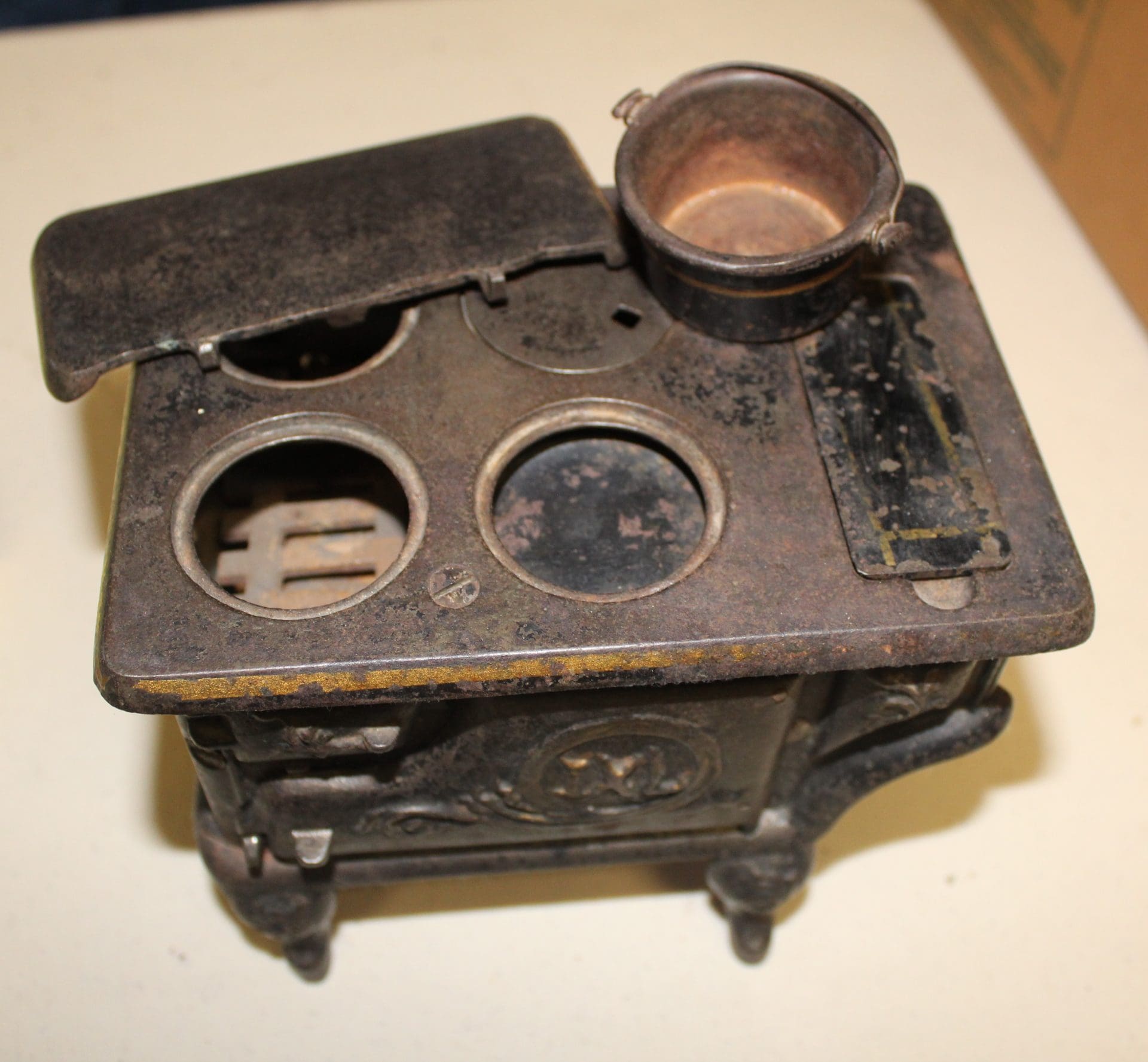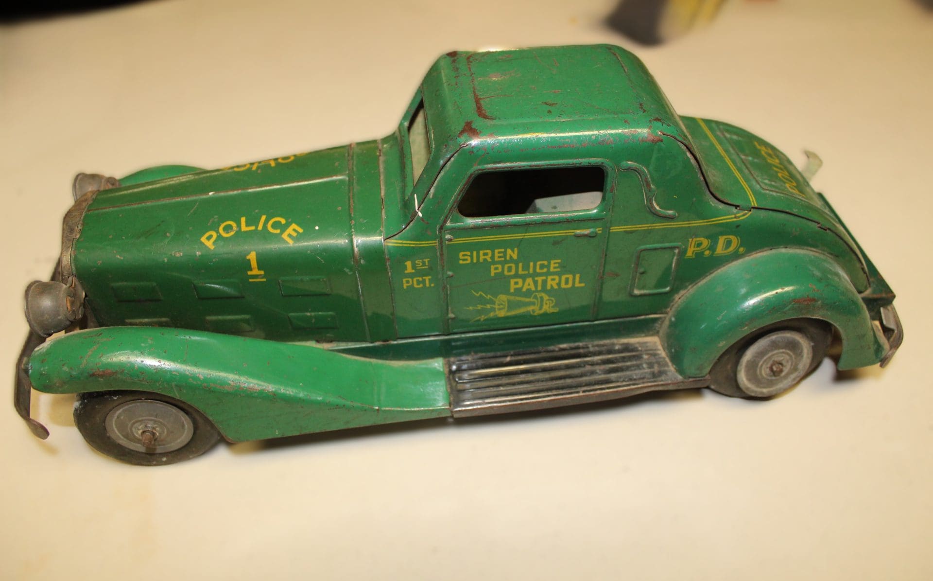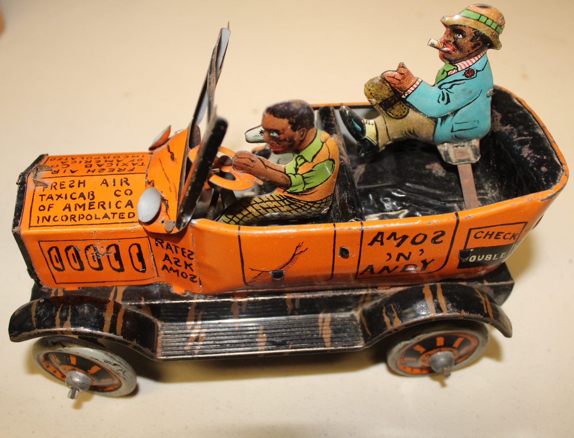 TIN, CAST TOYS & WIND UPS – Amos & Andy Fresh Air Taxi Cab Car; Kitten w/Yarn; Pheasant; Tricky Taxi car; Teeter-Totter w/Boy & Girl; Dump Truck; Wind-Up Honeymoon Express w/Hoola Hoop Bear; George the Drummer Boy Wind Up Soldier; Lone Ranger & Tonto w/horses; Alabama Coon Jigger Doll in Orig. Box; Mech. Clown on Roller Skates; Skee-ball w/Man; Metal Siren Police Patrol Car; Watch Joe Go Metal Car w/Atomic Brakes; Metal Truck w/Circus Carousel; Tin Train w/Orig. Box; Metal Donkey w/Clown in Side Car; Caterpillar Dozer w/Man & Rubber Tracks; Green truck w/Wdn. Wheels; Horse Van; Jeep w/Soldier; Dionne Quints & Other Paper Dolls; Cast Iron Toys – 2 Bottom Plow, Tractor w/Driver, Disc, Corn Planter, Sickle Mower; Lone Ranger Cap Pistols w/Belt; Metal Delaval Tin Cow (Broken Tail) & Calf; Roy Rogers Harmonica; Kerosene Viewer w/glass slides; Dick Tracy Watch JD PT Combine & Ring;