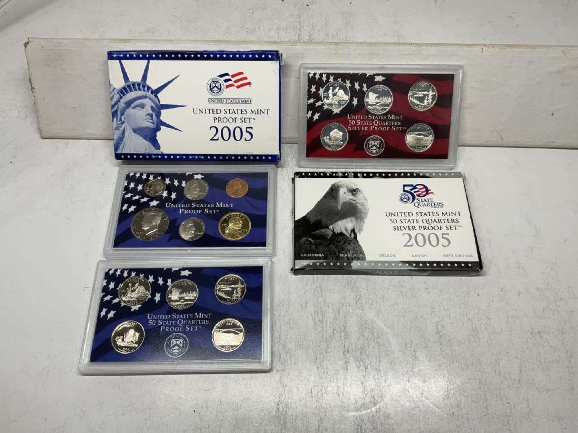 Multiple U.S. Mint proof sets, uncirculated sets, commemoratives, and specialty coin collections.
