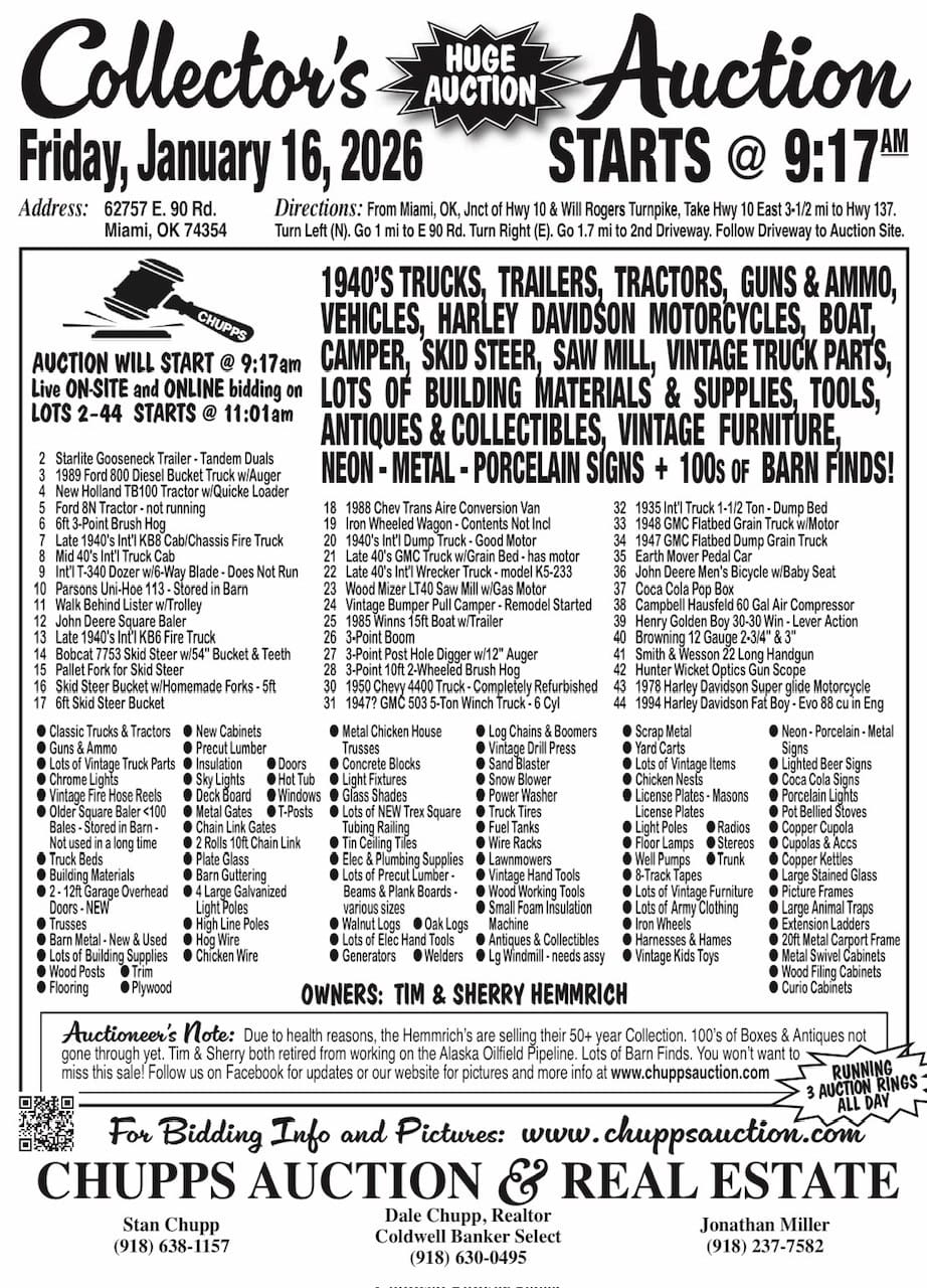 Directions: From Miami, OK, Jnct of Hwy 10 & Will Rogers Turnpike, Take Hwy 10 East 3-1/2 mi to Hwy 137. Turn Left (N). Go 1 mi to E 90 Rd. Turn Right (E). Go 1.7 mi to 2nd Driveway. Follow Driveway to Auction Site.