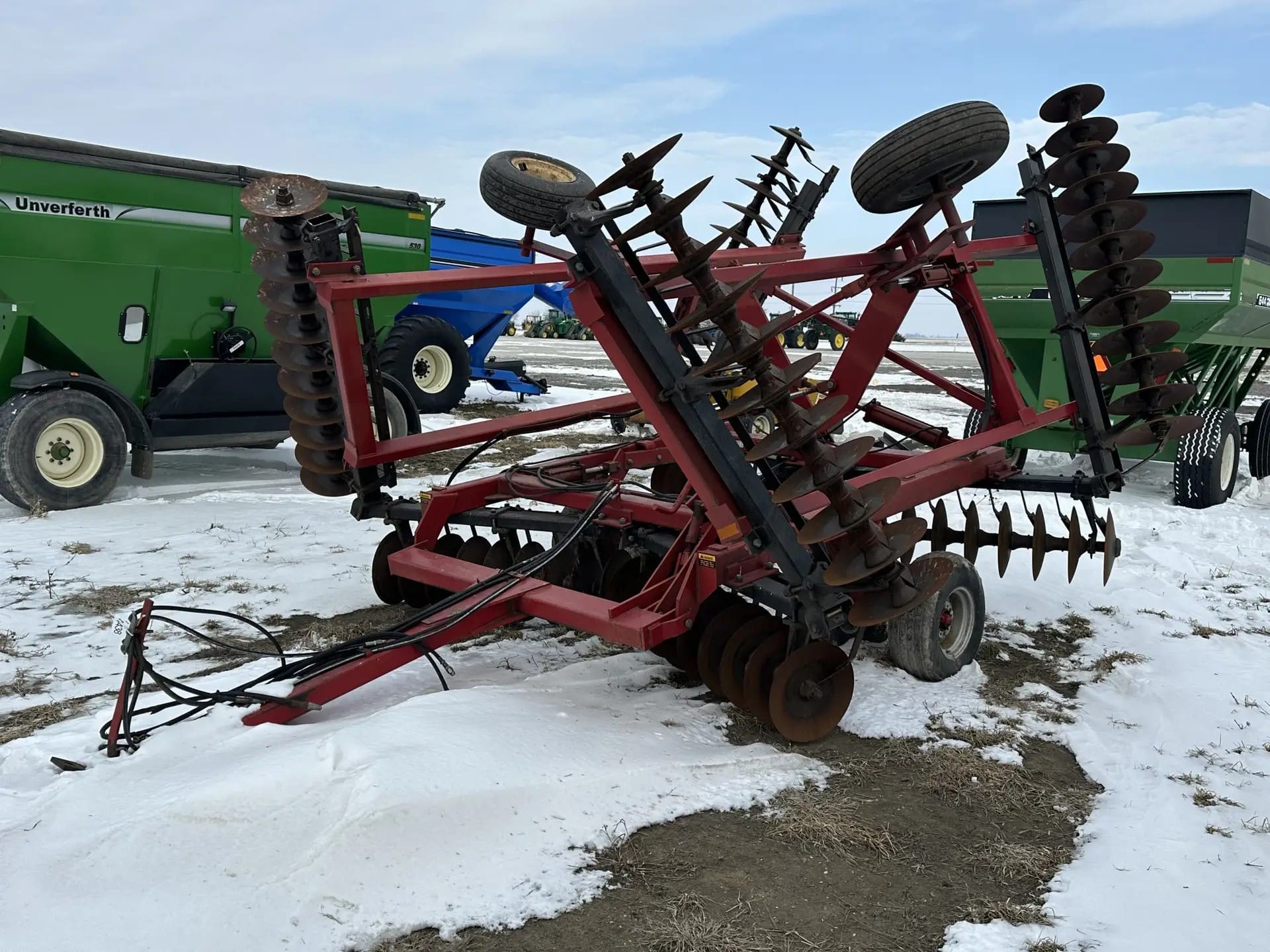 International 480 disk, 9.5-11 Tires, Hydraulic Cylinder Lift, Manual Fold Wings, 20′ Width, 7-1/2″ Spacings, SN: 480U1111