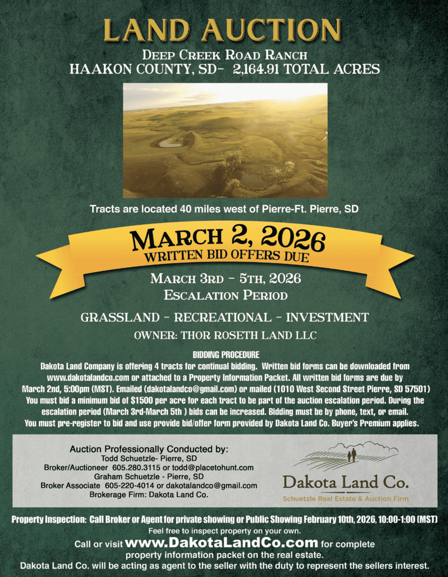 3.Escalation Period- bidders can raise their bids from MARCH 3RD until MARCH 5TH 5:00pm (MST). Bid forms can be by submitted by phone/text(605-280-3115, 605-220-4014) or email (dakotalandco@gmail.com or , todd@placetohunt.com).