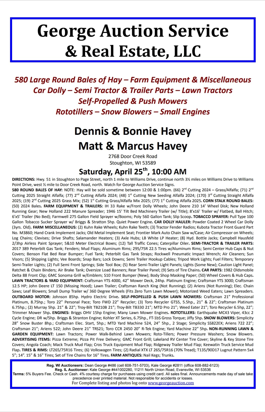 580 Large Round Bales of Hay – Farm Equipment & Miscellaneous Car Dolly – Semi Tractor & Trailer Parts – Lawn Tractors Self-Propelled & Push Mowers Rototillers – Snow Blowers – Small Engines