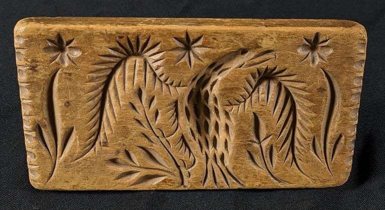 - ANTIQUE PRIMITIVE CARVED WOOD BUTTER PRINT MOLD STAMP PINEAPPLE & FERN