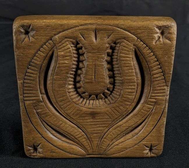 - ANTIQUE PRIMITIVE CARVED WOOD BUTTER PRINT MOLD STAMP FLEUR-DE-LIS