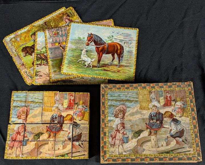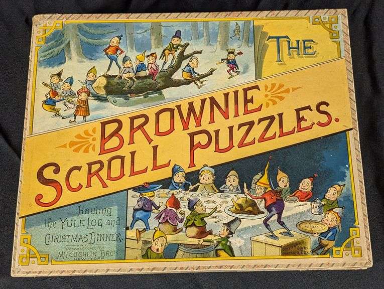 - 1891 PALMER COX THE BROWNIE SCROLL PUZZLES HAULING YULE LOG & CHRISTMAS DINNER MC LOUGHLIN BROS