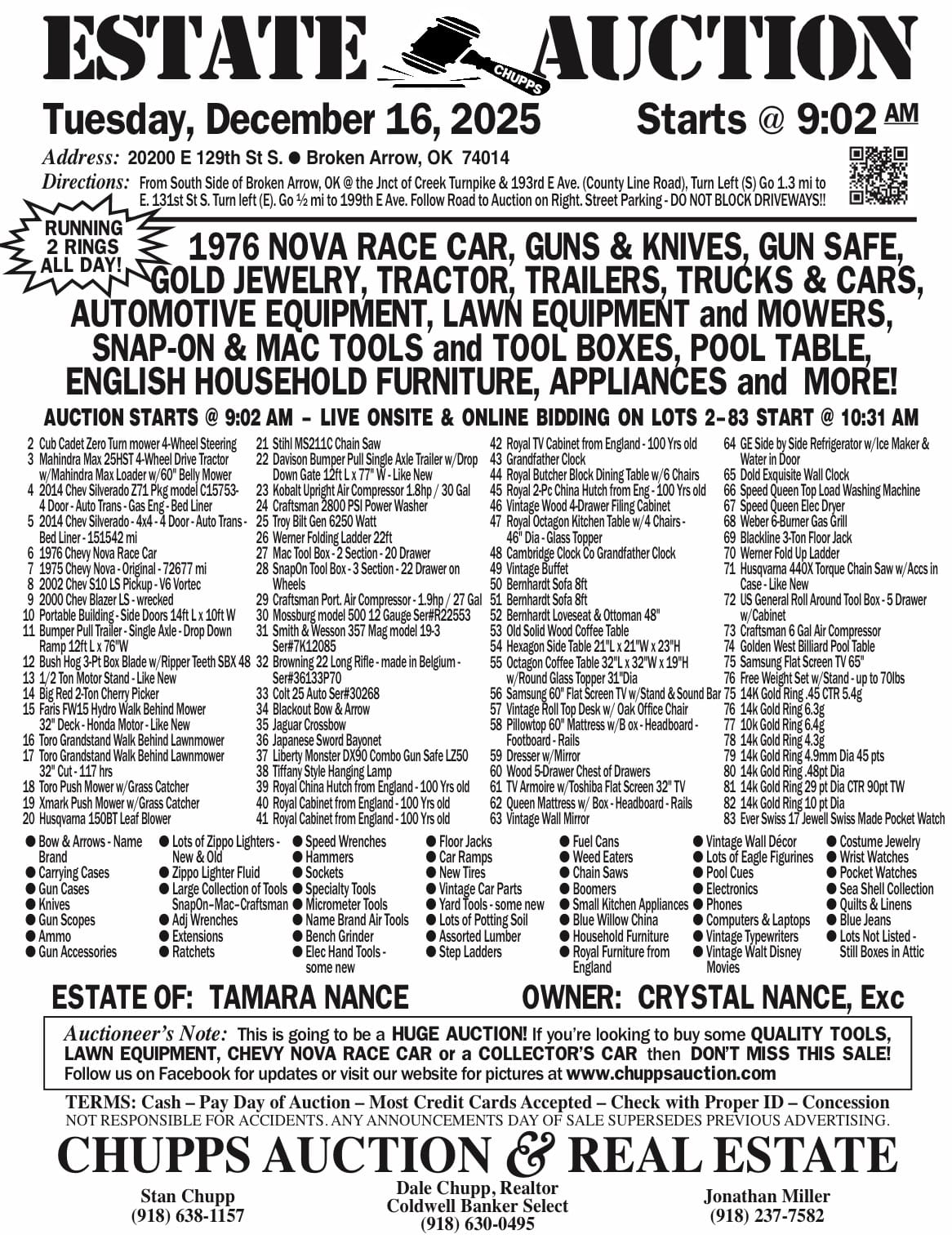 1976 NOVA RACE CAR, GUNS & KNIVES, GUN SAFE, GOLD JEWELRY, TRACTOR, TRAILERS, TRUCKS & CARS, AUTOMOTIVE EQUIPMENT, LAWN EQUIPMENT and MOWERS, SNAP-ON & MAC TOOLS and TOOL BOXES, POOL TABLE, ENGLISH HOUSEHOLD FURNITURE, APPLIANCES and MORE!