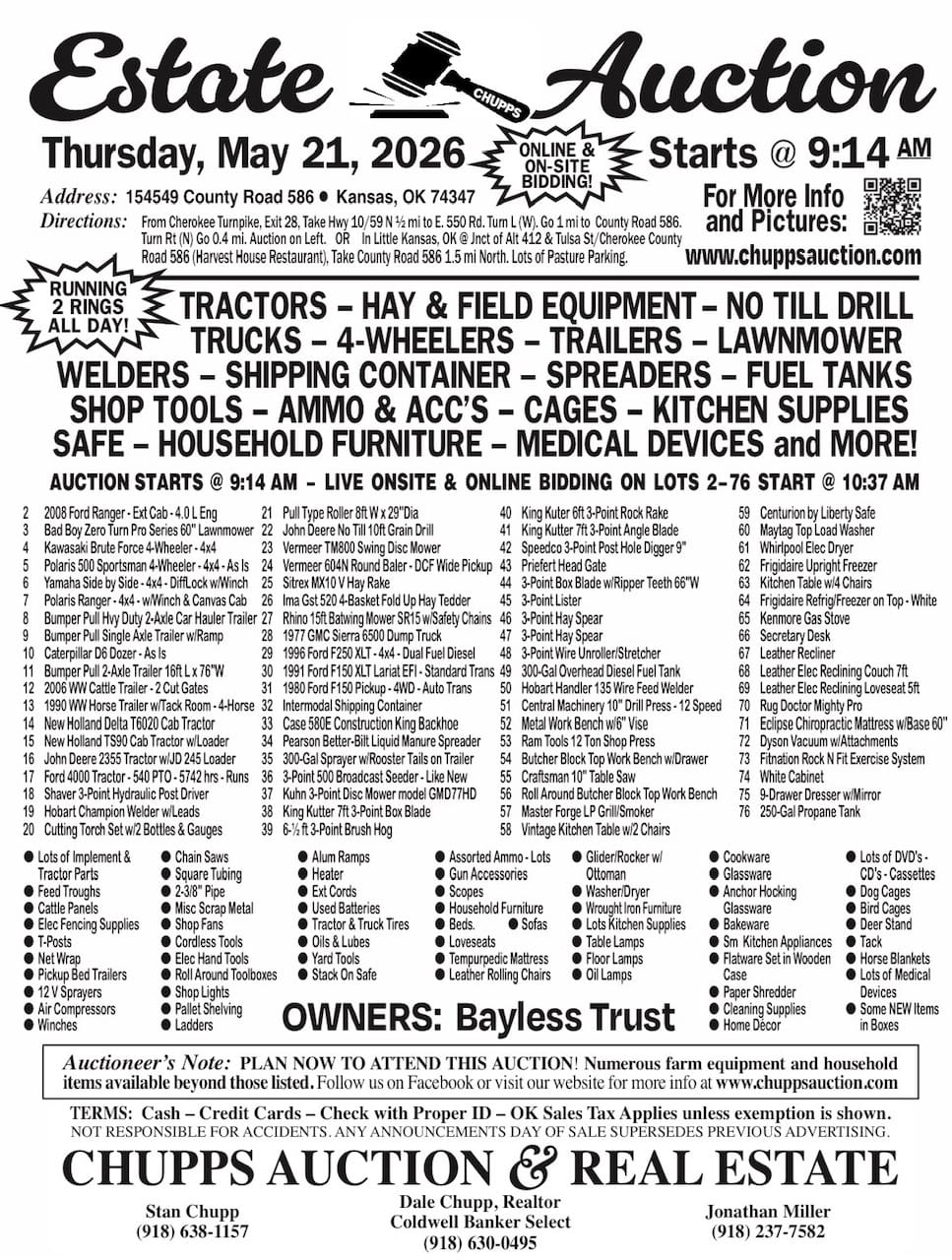 To bid or view complete auction catalog, click here: https://chuppsauction.hibid.com/catalog/733024/may-21—bayless-estate-auction