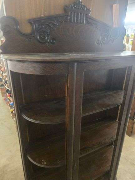 Oak China cabinet • Small Danish desk • Rods & reels • Tackle box