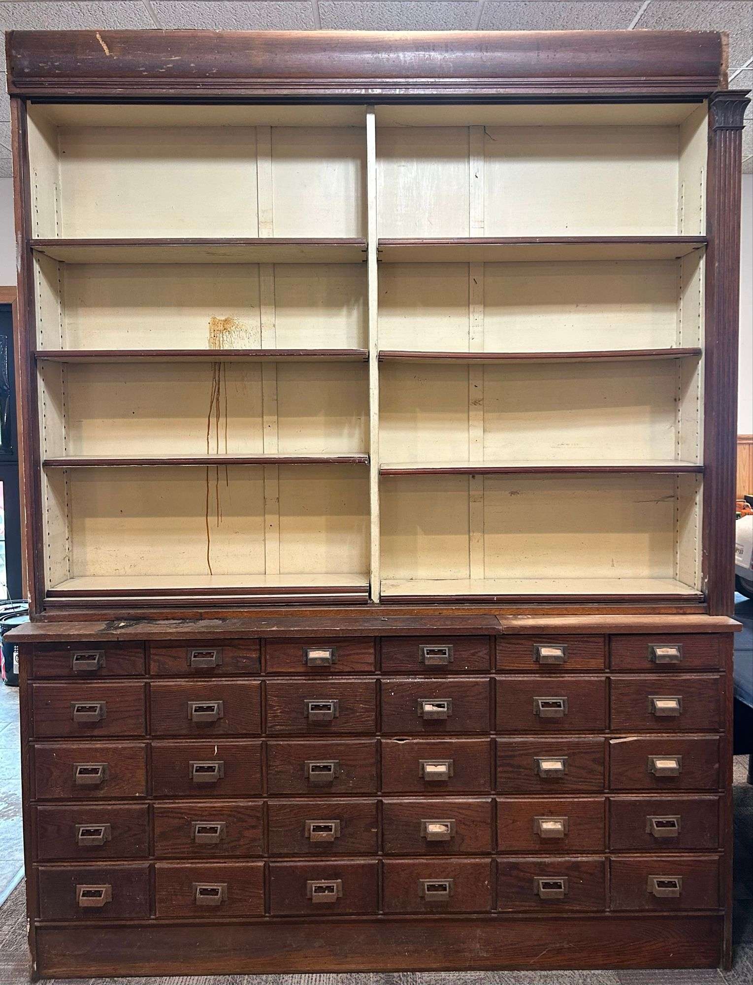 - Large Wooden Two-Piece Store Cabinet with Open Shelving & Drawers