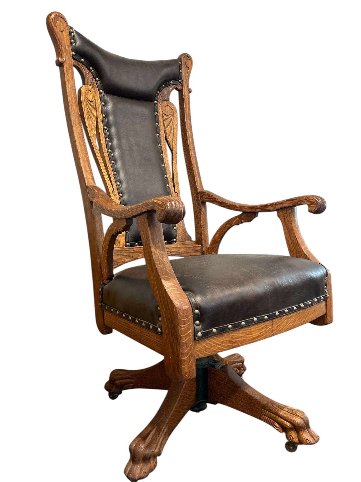 - Antique Oak Swivel Office Armchair w/ Faux Leather Upholstery & Claw Feet on Casters