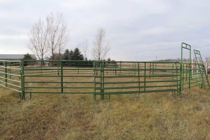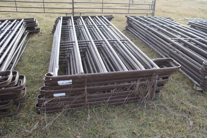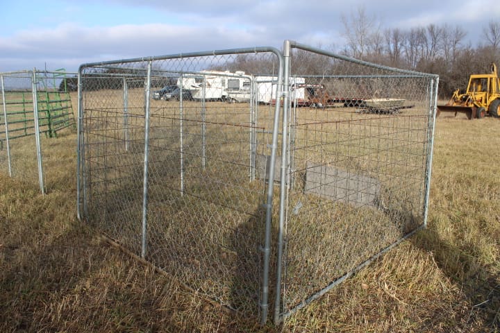 H&W PANELS & PRIEFERT PANELS, CHAIN LINK DOG KENNELS: 11 – 11 ½’ H&W Corral Panels & 1 4’ Walk Gate; 30 – Good 10’ Priefert Corral Panels; 9 – Priefert Panels w/ Some Bends & 3 w/ Bad Bottoms; 2 – 10’x10’ Chain Link Dog Kennels;