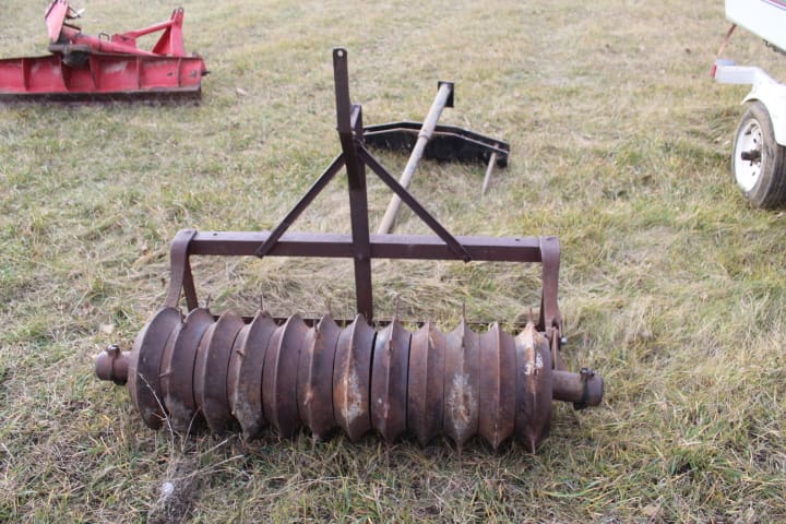 HAYING EQUIPMENT & OTHER EQUIPMENT: JD #535 Round Baler, Twine Tie, SN: 848036; NH #116 Hay Bine w/ Crary Dbl. Sickle Bar, 16’ Head, Rubber on Rubber, SN: 580403; IH PT 5 Bar Side Del. Rake; PT 10’ Box Scraper; NH Pt Manure Spreader – 10’; JD BW 14’ Disk w/ 12’ Front; PT 10’ Packer w/ Chain Drags; Land Pride 3 Pt. Post Hole Digger w/ 9” Bit; 3 Pt. Ditcher; 3 Pt. Driveway Angle Blade, 6’; Bucket Mt. Bale Spear;
