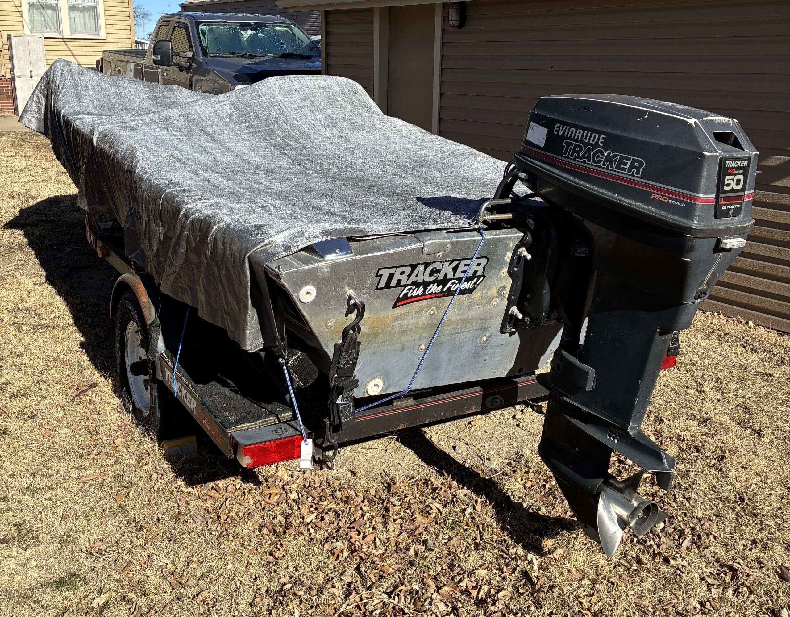 1989 Bass Tracker Tournament TX with trailer, depth finder, 2 fuel tanks, 50 HP Mercury