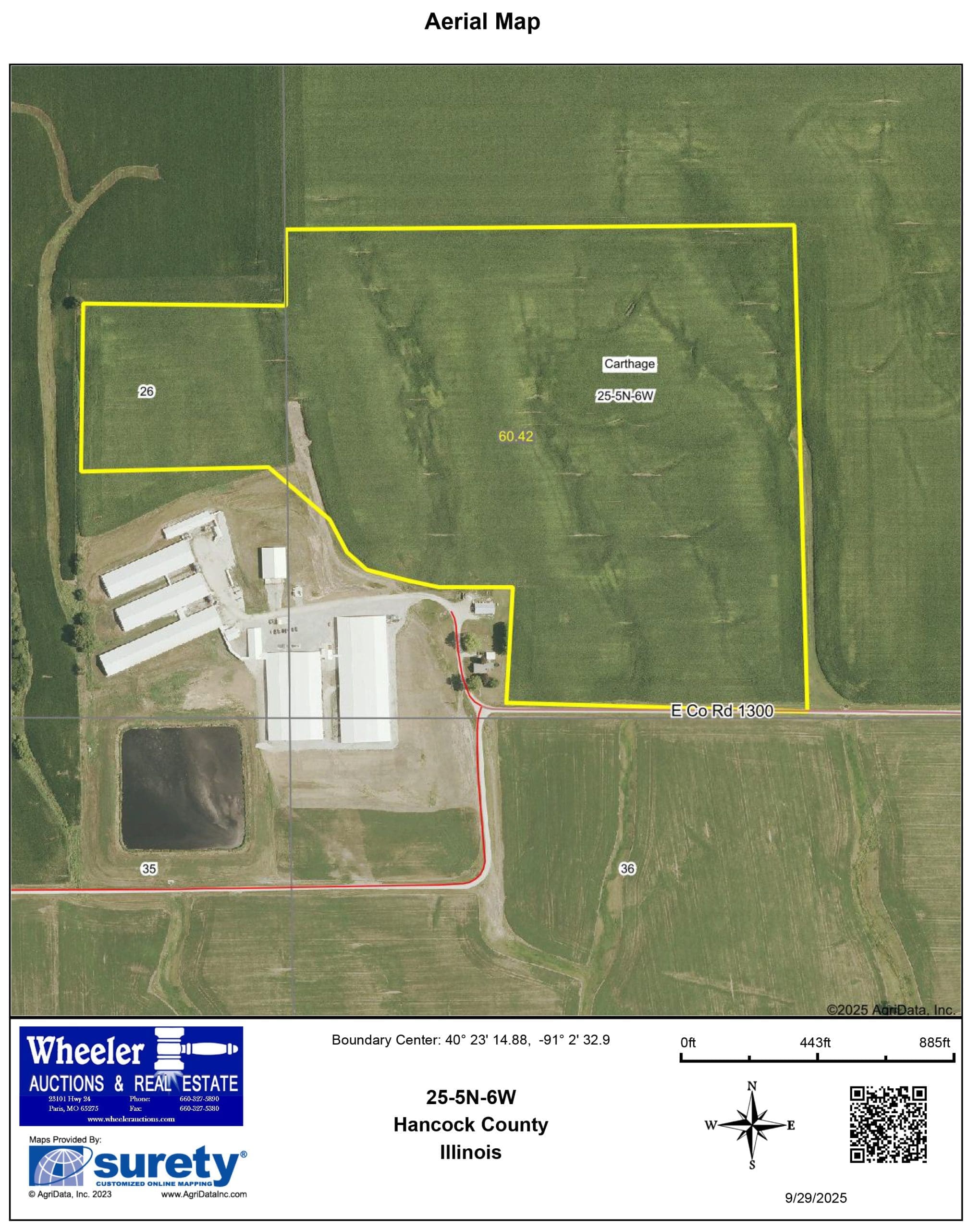 From Carthage, take 336 east 4 miles to County Road 2450 East. Travel 2 miles south and turn west on 1300 North. Tract 2 lies on the south side of 1300 North. Travel west 2/10th of a mile and tract 1 lies on the north side on 1300 North.