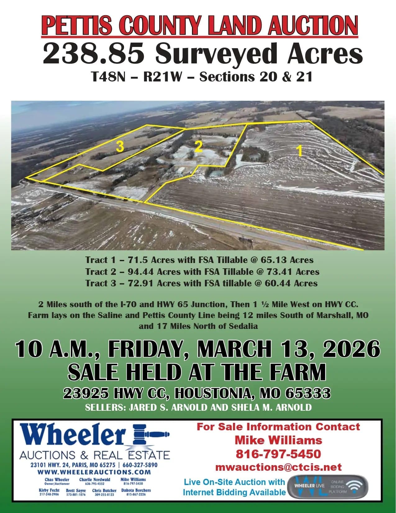 Wheeler Auctions is proud to represent the Arnold’s and present this high-quality Pettis County Farm located just 2 miles off Hwy 65 and bordered on 2 sides by blacktop HWY CC and Hwy RB.