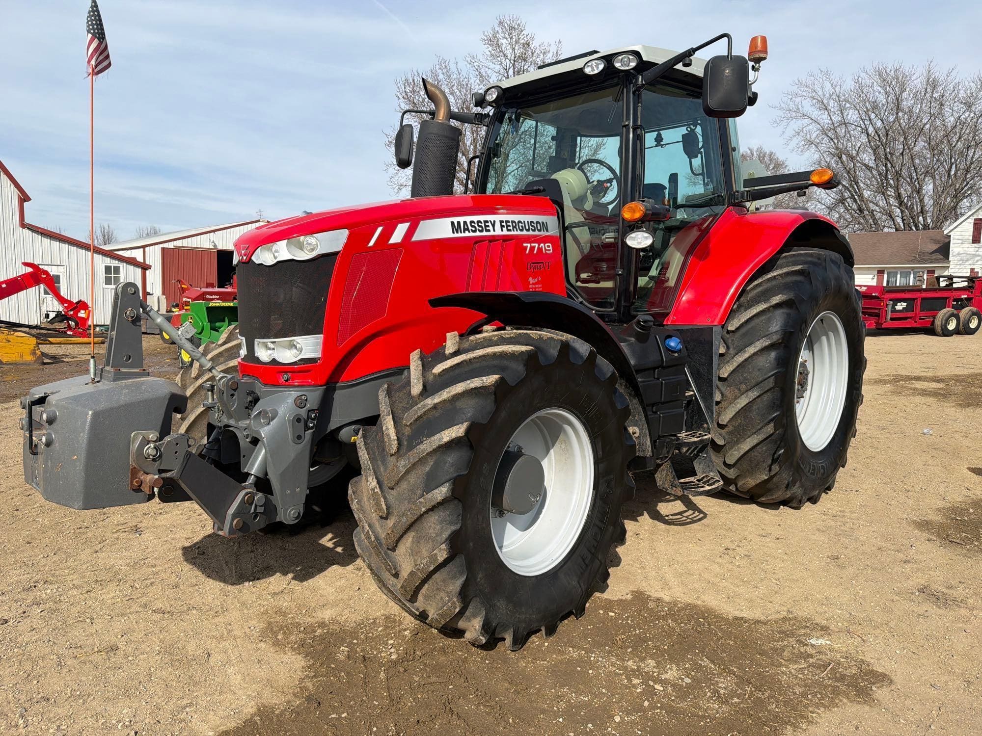 Tractors: 2016 Massey Ferguson 7719 MFWD Tractor–2nd Owner—SN:AGCM7719HGN951009, shows 6239 hours, left hand reverser, buddy seat, front 3pt, front weight, Dyna VT transmission, new alternator, 1000 pto, 4 remotes, rear 3pt, radio, 710/70R38 rear tires, 600/65R28 front tires, front fenders