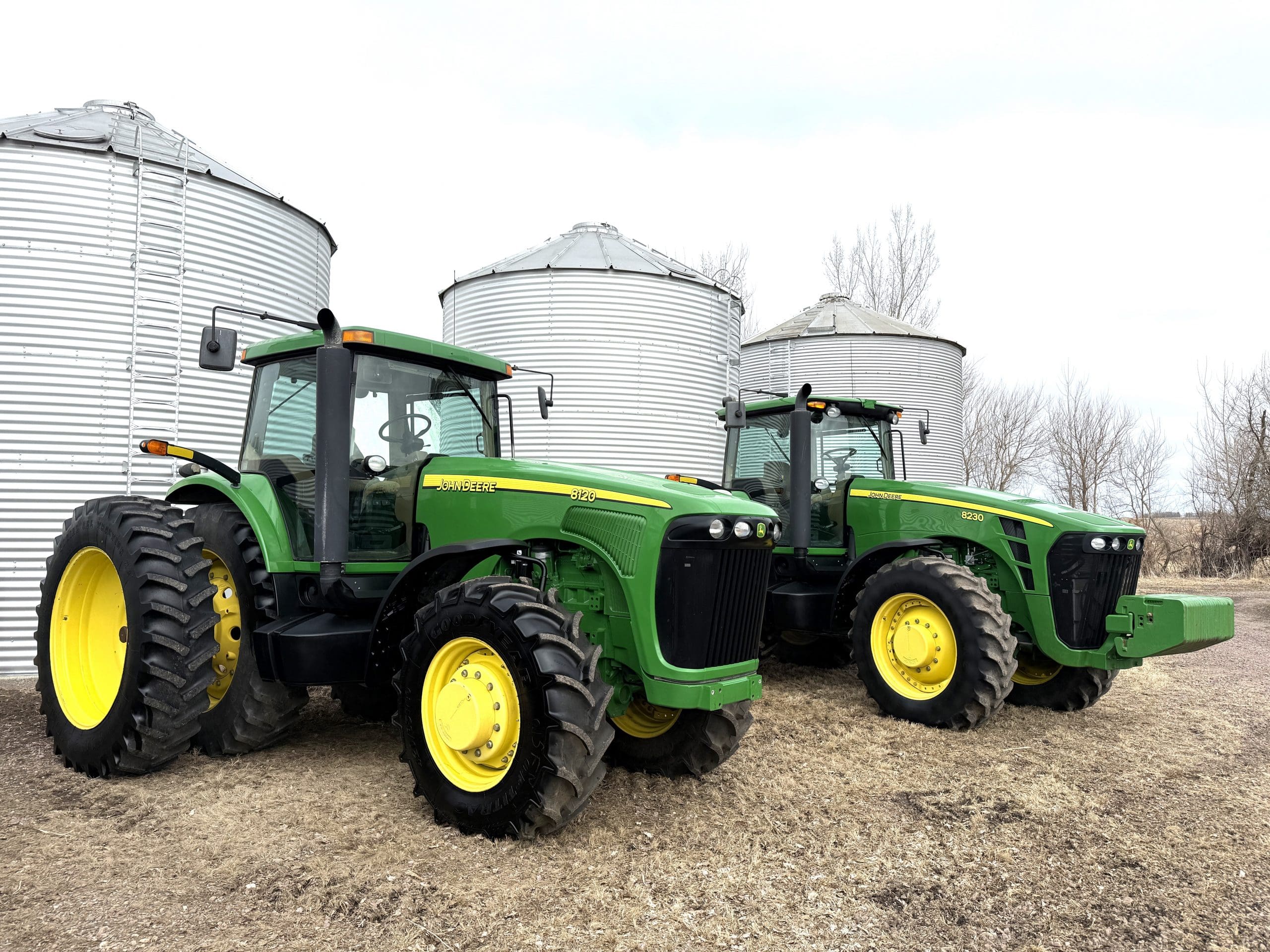 2007 John Deere 8230 MFWD Tractor—2nd Owner—SN:RW8230P016544, 1225 actual hours, current owner has owned this tractor since it had 400 hours, 22—front JD 47kg suitcase weights, 2 sets of rear wheel weights, front fenders, JD active seat, buddy seat, heat, a/c, radio, 4 remotes, 3pt w/ quick hitch, 16/4 speed powershift, greenstar ready, 420/85R34 front tires—60%+, 480/80R50 rear tires w/ duals—80%: