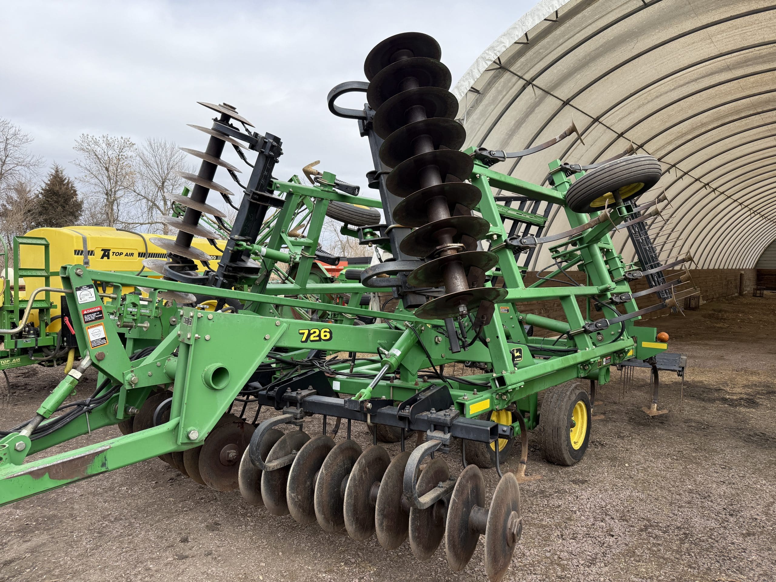 Disk: 2005 John Deere 637 23ft 7” Disk—1 Owner—SN:N00637X007665, 23 1/2” front blades, 23 3/4” rear blades, hyd leveling, 3 bar rear harrow
