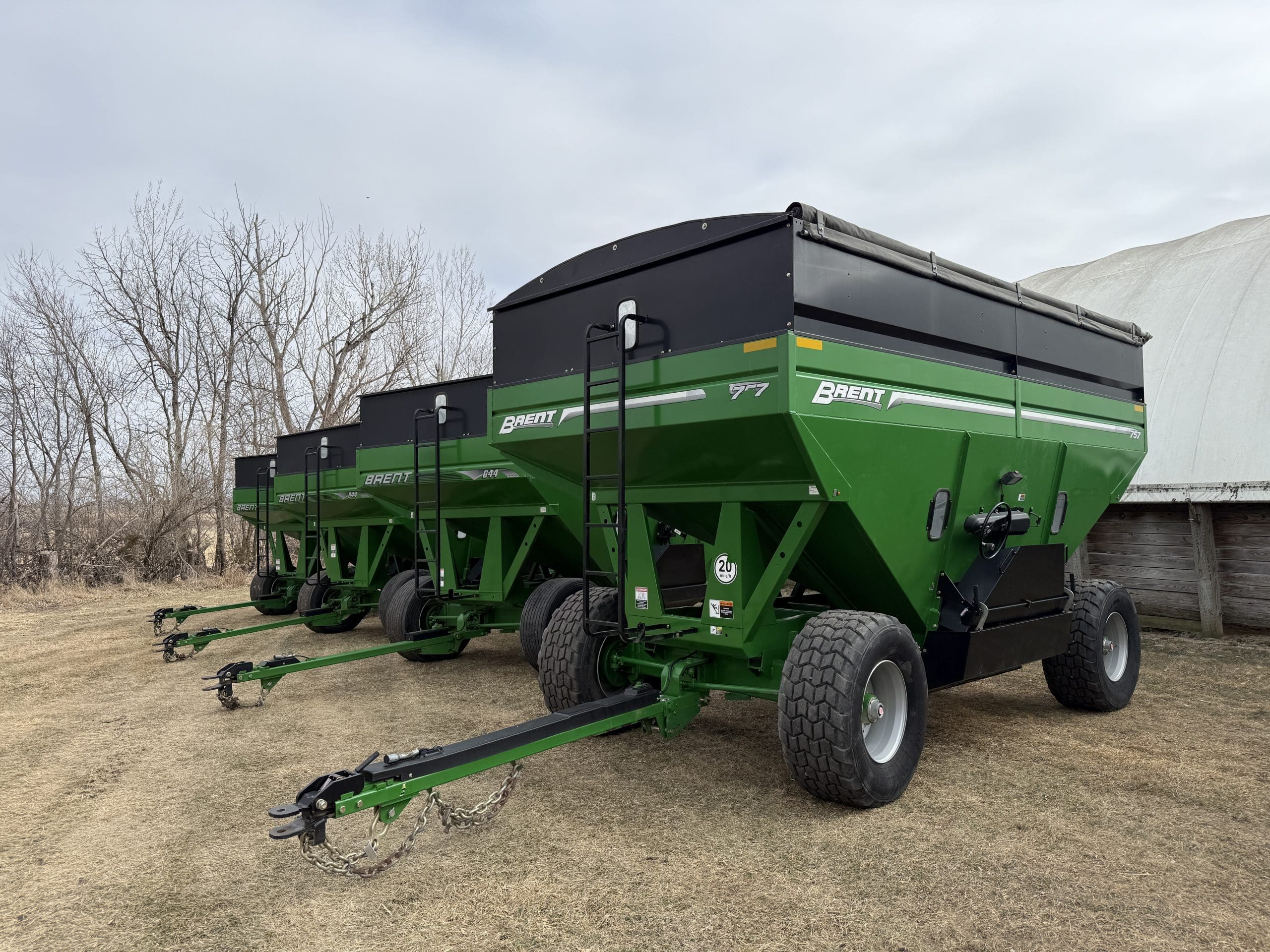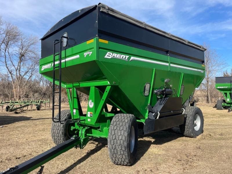 Gravity Wagons: Brent 757 Gravity wagon—1 Owner-SN:B39770108, brakes, manual roll tarp, side/center unload, chute light, viewing windows, 460/65R22.5 tires:
