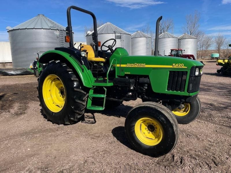 2WD Tractors: 2004 John Deere 5420 2WD tractor—1 owner—SN: LV5420S443143, 1465 hours, sync shuttle, quad, roll bar, open station, 2 remotes, 540 pto, 3pt, 16.9R30 rear tires: