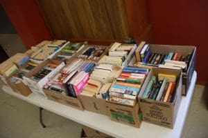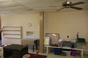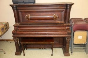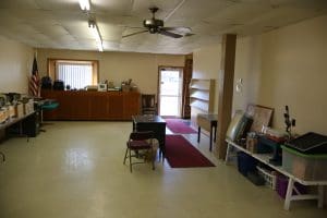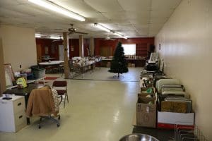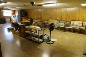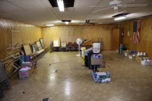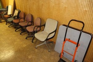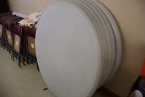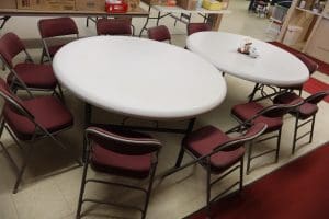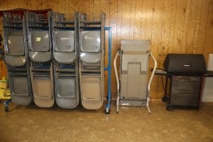 Tables – (3) 6ft white folding, (3) 6ft folding, (6) 8ft folding, (112) Metal Folding Chairs on Rack, (22) Metal Folding Chairs, Office Chairs, Poker Table, Office Supplies, Bingo Game Sets, Projectors, Karaoke Machine, Desk, Bench, 2 Drawer File Cabinet, Vintage Piano recently tuned, Lots of Books, Games, Mops & Buckets, Metal rolling Cart, Fans, Podium, Wheel Chair, Card Tables, Flags