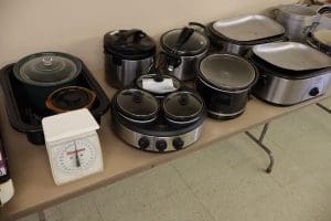 Kitchen Items – GE Refrigerator, GE Electric Stove, Buffet Pans, Pots, Pans, Baking, Storage Containers, Electric Roasters, Crock Pots, Electric Skillets, Utensils, Microwave, Large Coffee Makers, Glassware, Coffee Carafes, Measuring Cups, Squirt Bottles, Cups, Bowls, Plates, Flatware, Recipe Books, Bunn Coffee Maker