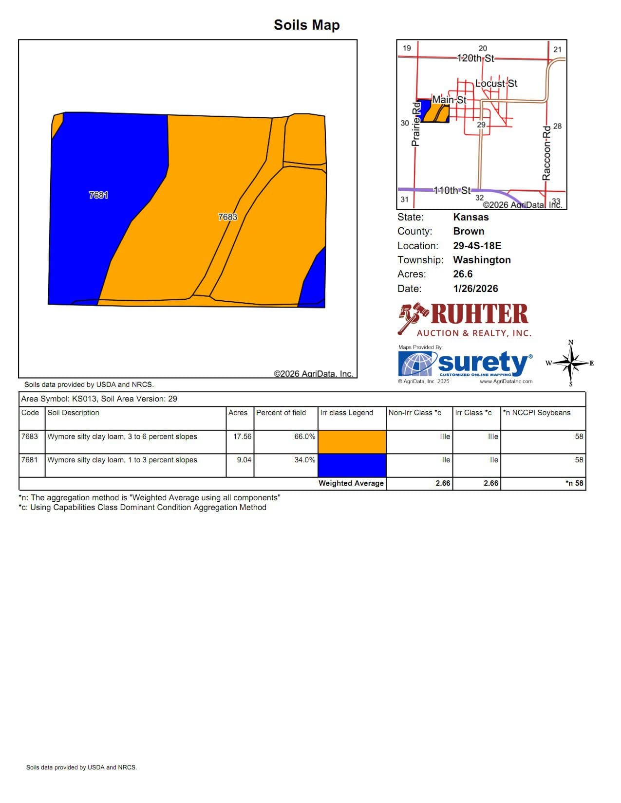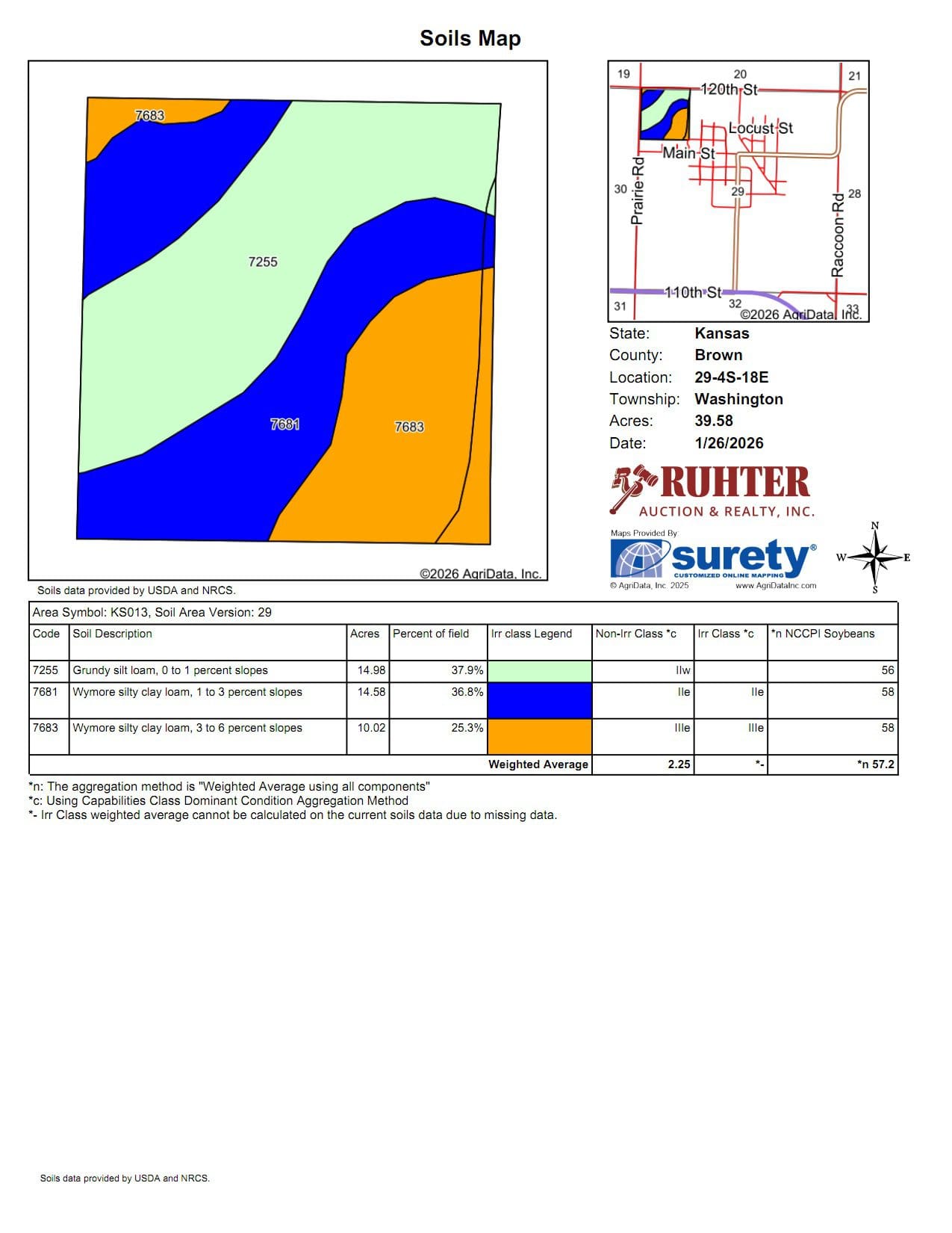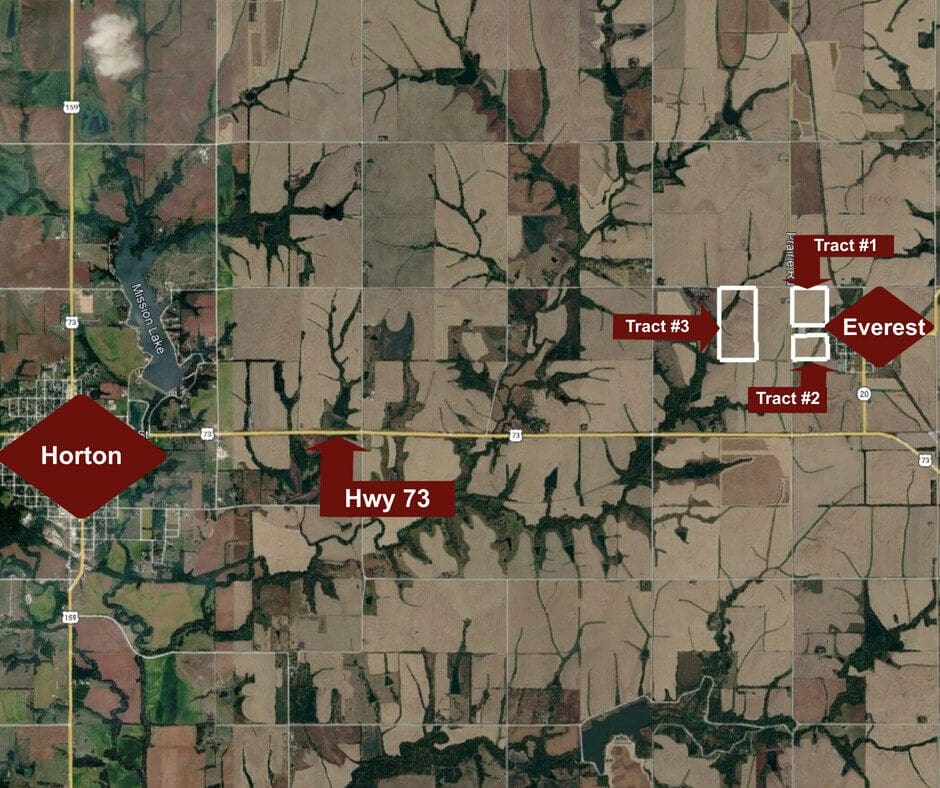 The Brown County Kansas land auction includes 146.20± acres of non-irrigated farmland located near Everest, Kansas. This offering consists of three separate tracts, each featuring a strong percentage of tillable cropland with productive soils suited for dryland row-crop production. Because the tracts will sell individually and not in combination, buyers can bid on the parcel that best fits their operation or investment goals.