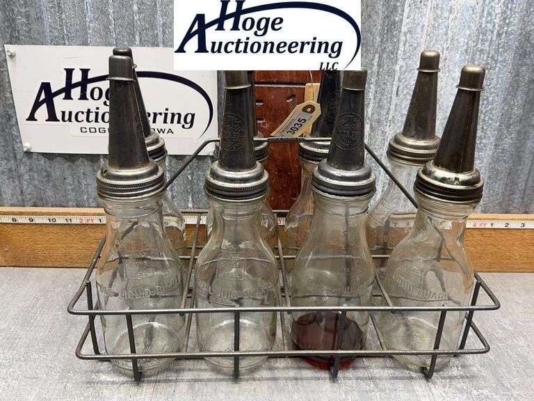 - 8 OIL JARS W/ SPOUTS, IN WIRE CARRIER