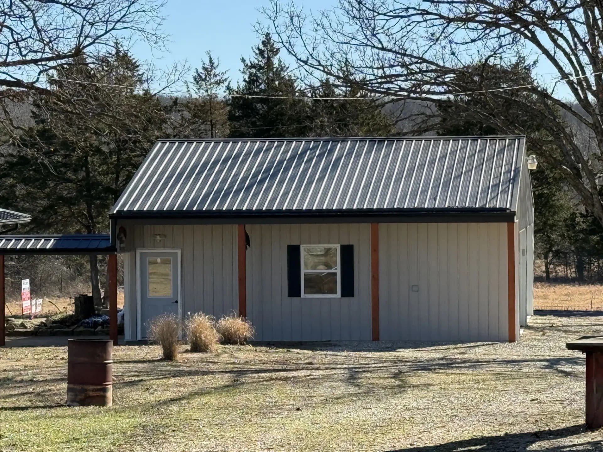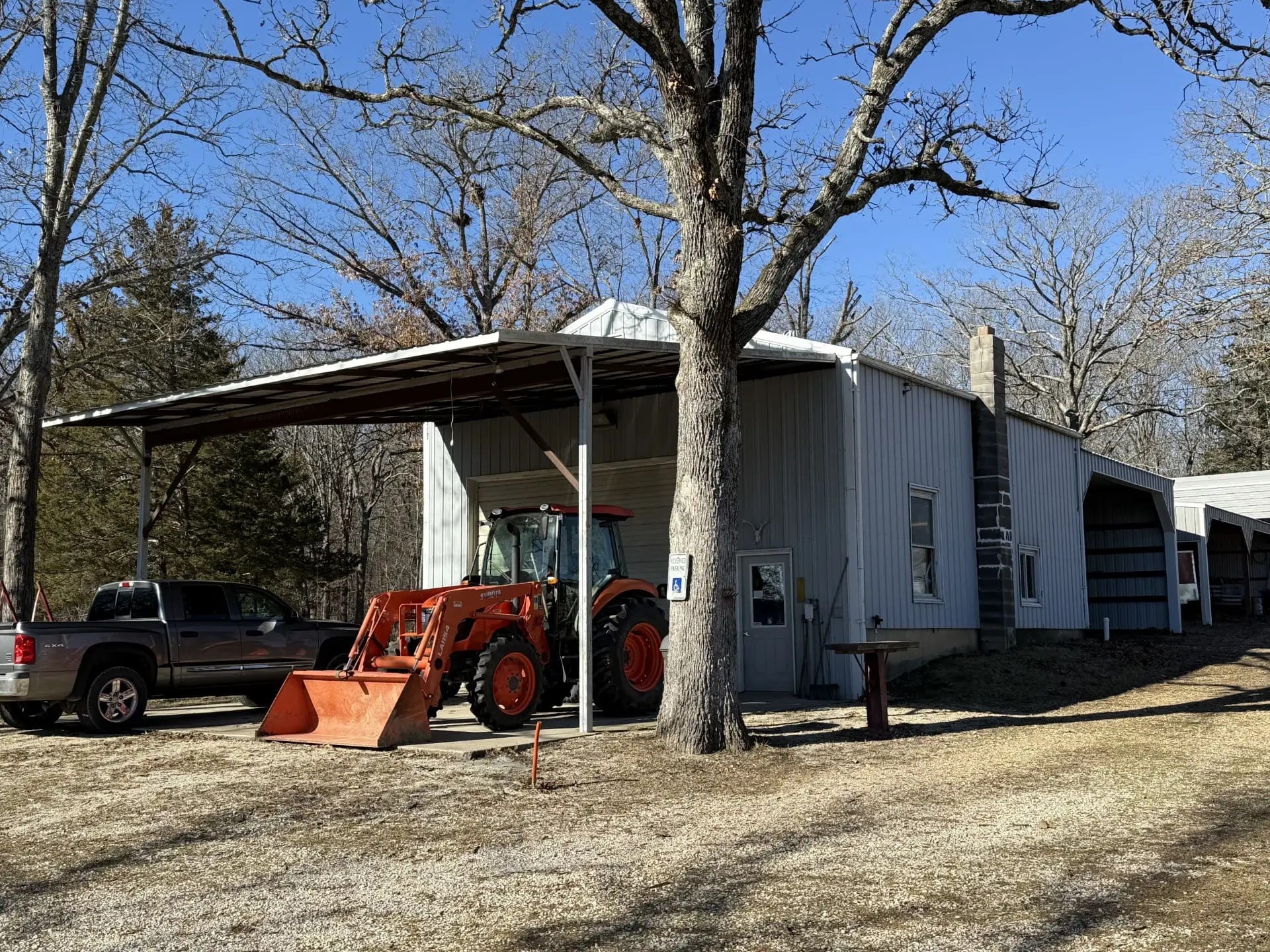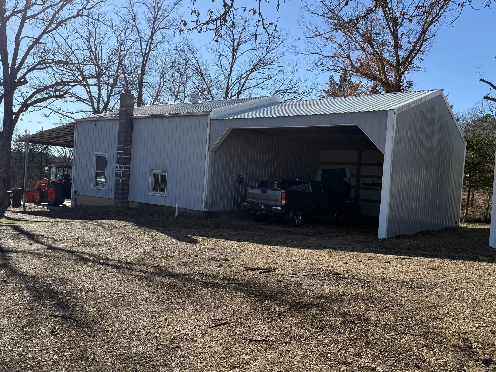Tract One also has a very functional 28’ x 57’ structure on it, that is connected but basically divided onto two different sections. The first section is Herb’s man cave/ shop, it is 28’ x 30’ x 16’ eve, it has a concrete footing, foundation and floor. It is insulated and has a heavy-duty wood-burning stove in it, also a rest room, electric cook stove, refrigerator and microwave oven, it is set up perfect for entertaining your rowdy friends, butchering or as an extra kitchen for canning . This section also has 12’ x 16’ insulated overhead door with electric opener and a 24’ x 28’ covered concrete apron in front of the overhead door. Herb worked on his over the road tractors in this shop. The back portion of this building is a 26’ x 26’ open front pole frame structure with a metal roof and sides.
