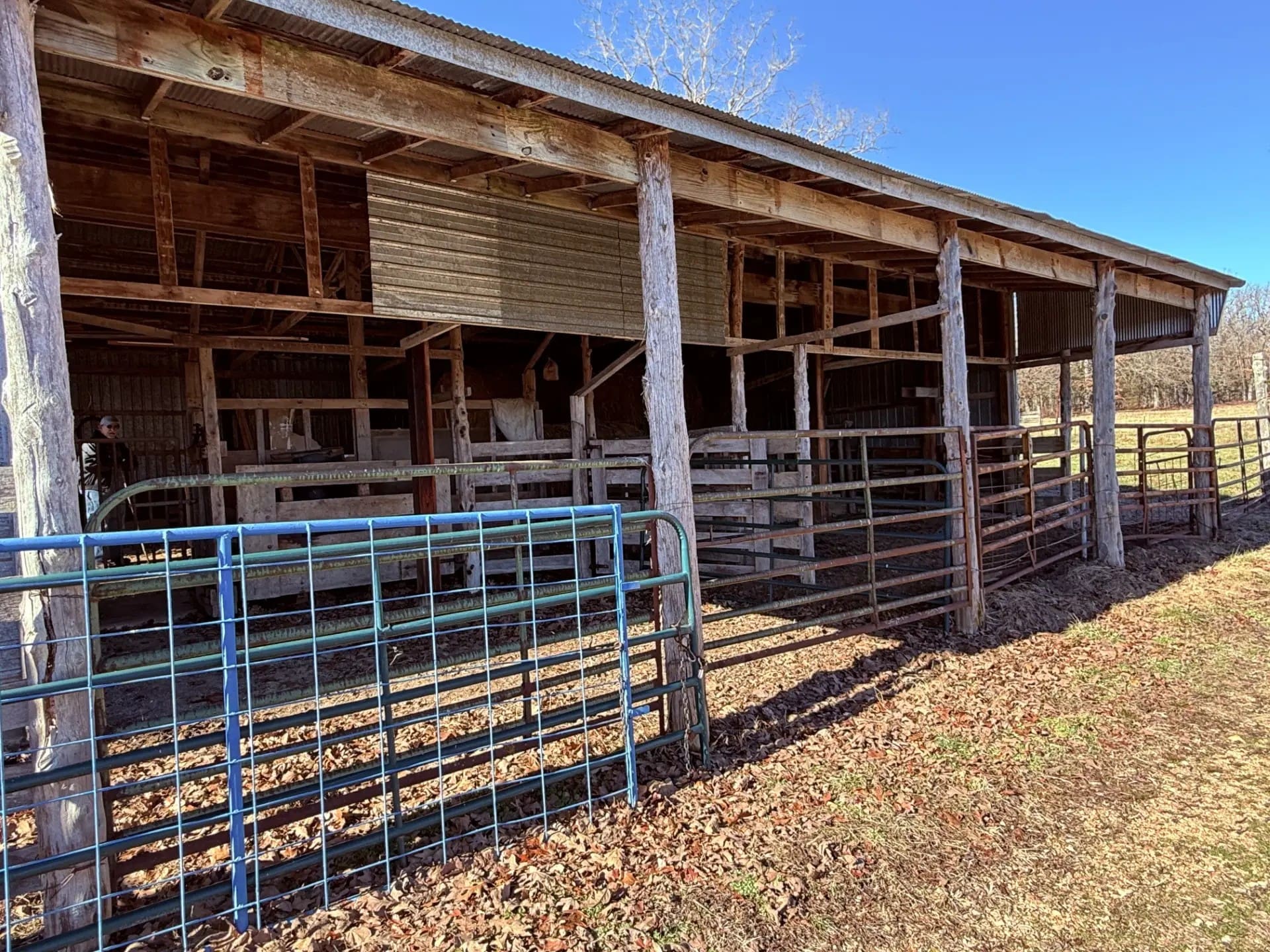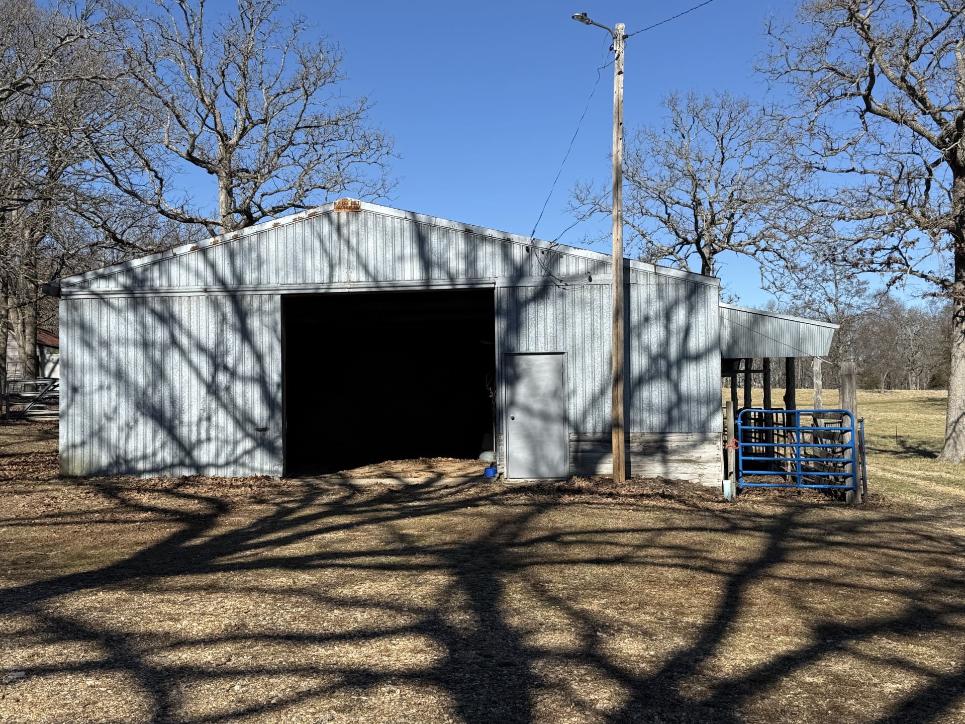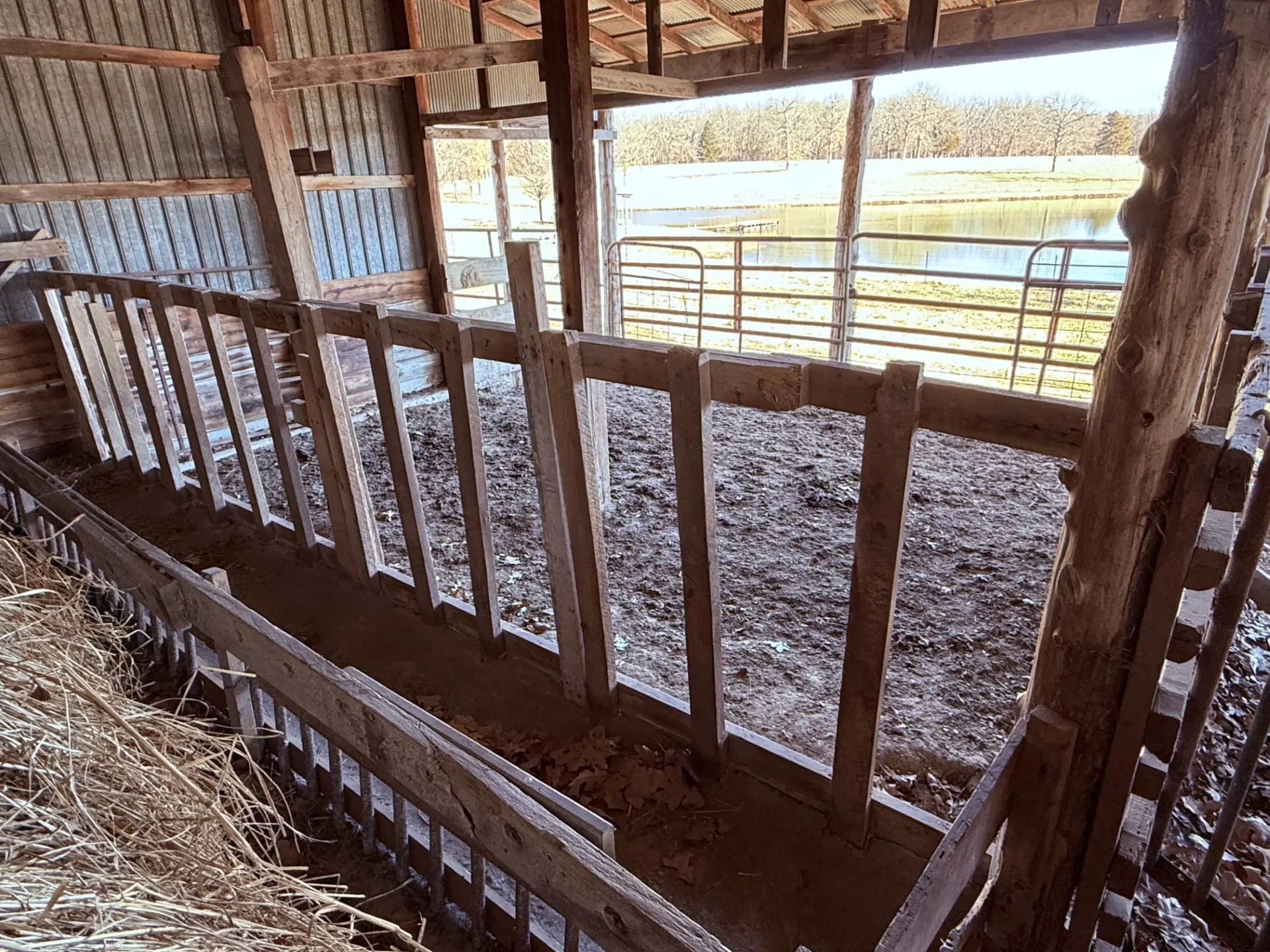 There is a 36’ x 44’ with 8’ lean-to, livestock/hay barn on this tract. It is a pole frame structure with tin siding and roof and large roll-back doors in each end, it has a partial concrete floor and a feed room in it, hay manger, cattle pens and is set up with alley way and head catcher.
