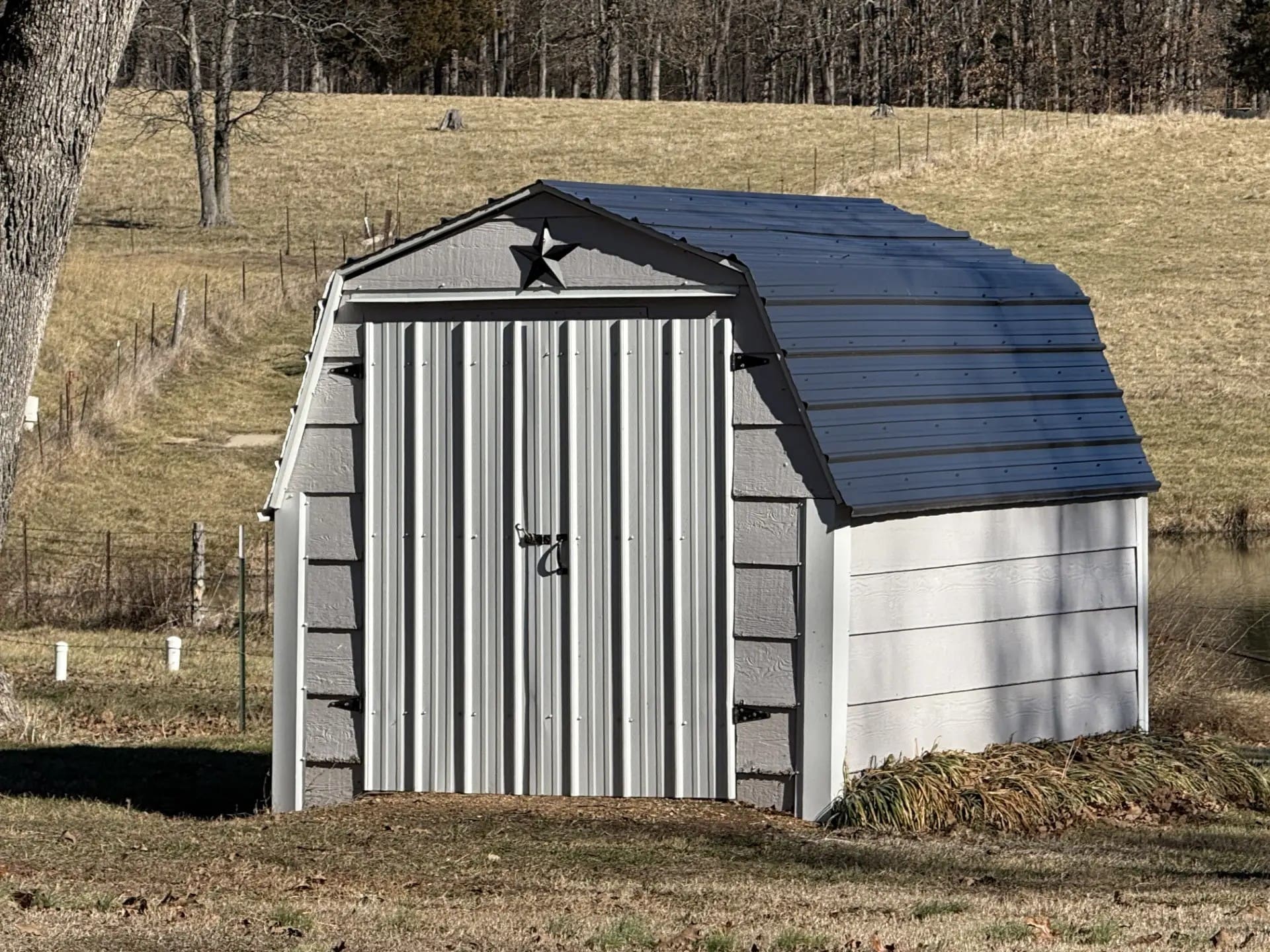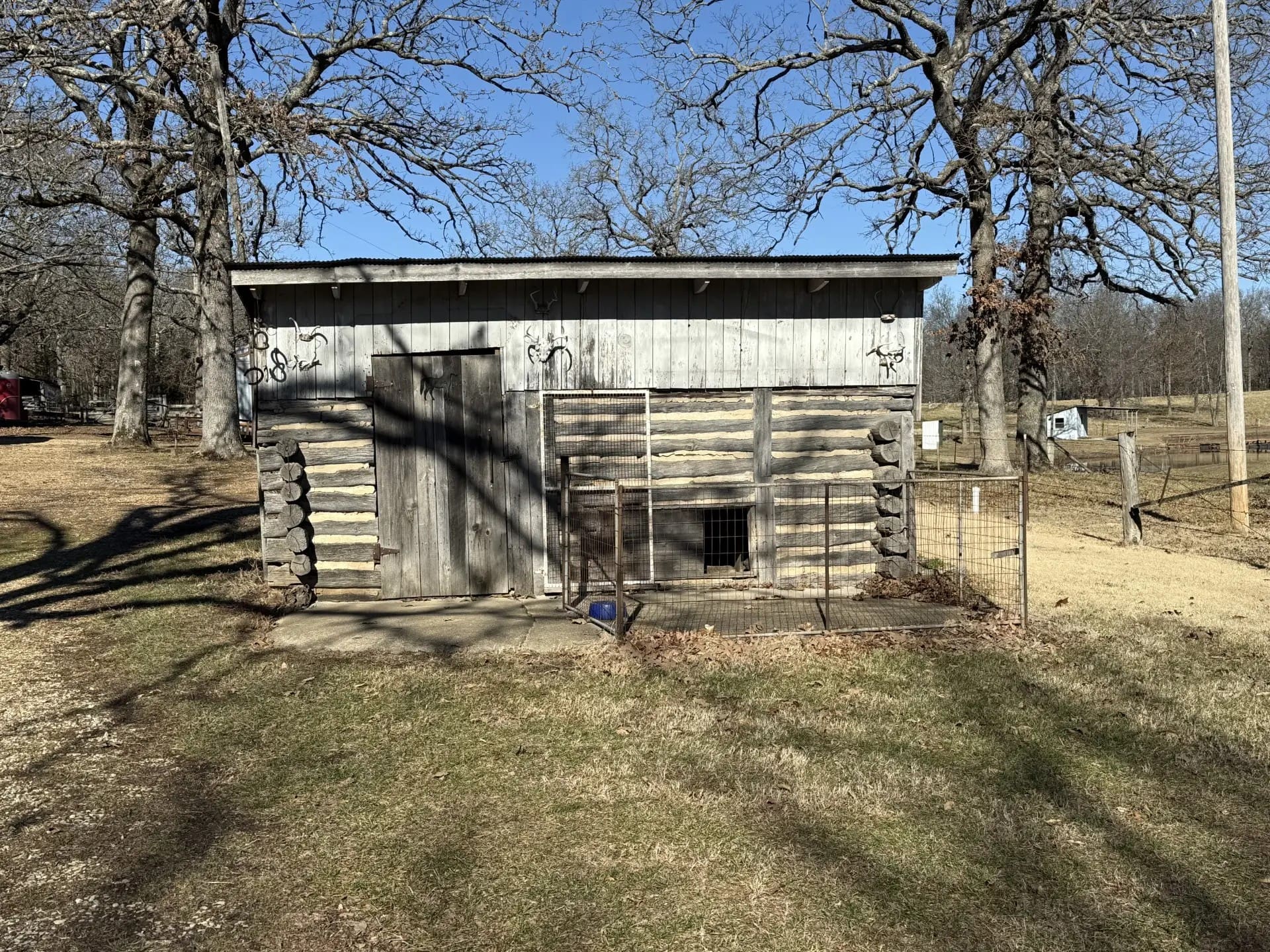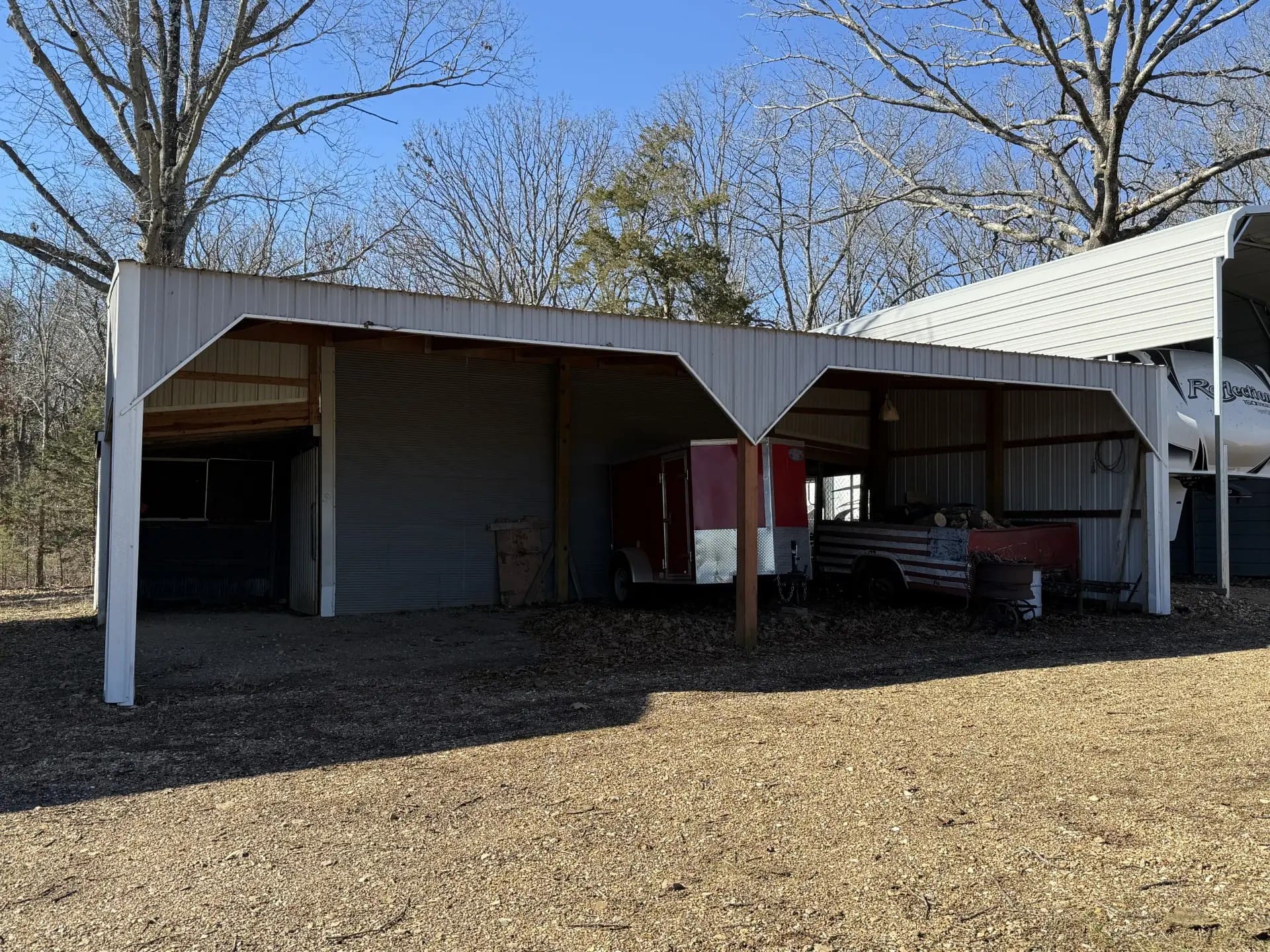 There is a 36’ x 44’ with 8’ lean-to, livestock/hay barn on this tract. It is a pole frame structure with tin siding and roof and large roll-back doors in each end, it has a partial concrete floor and a feed room in it, hay manger, cattle pens and is set up with alley way and head catcher.