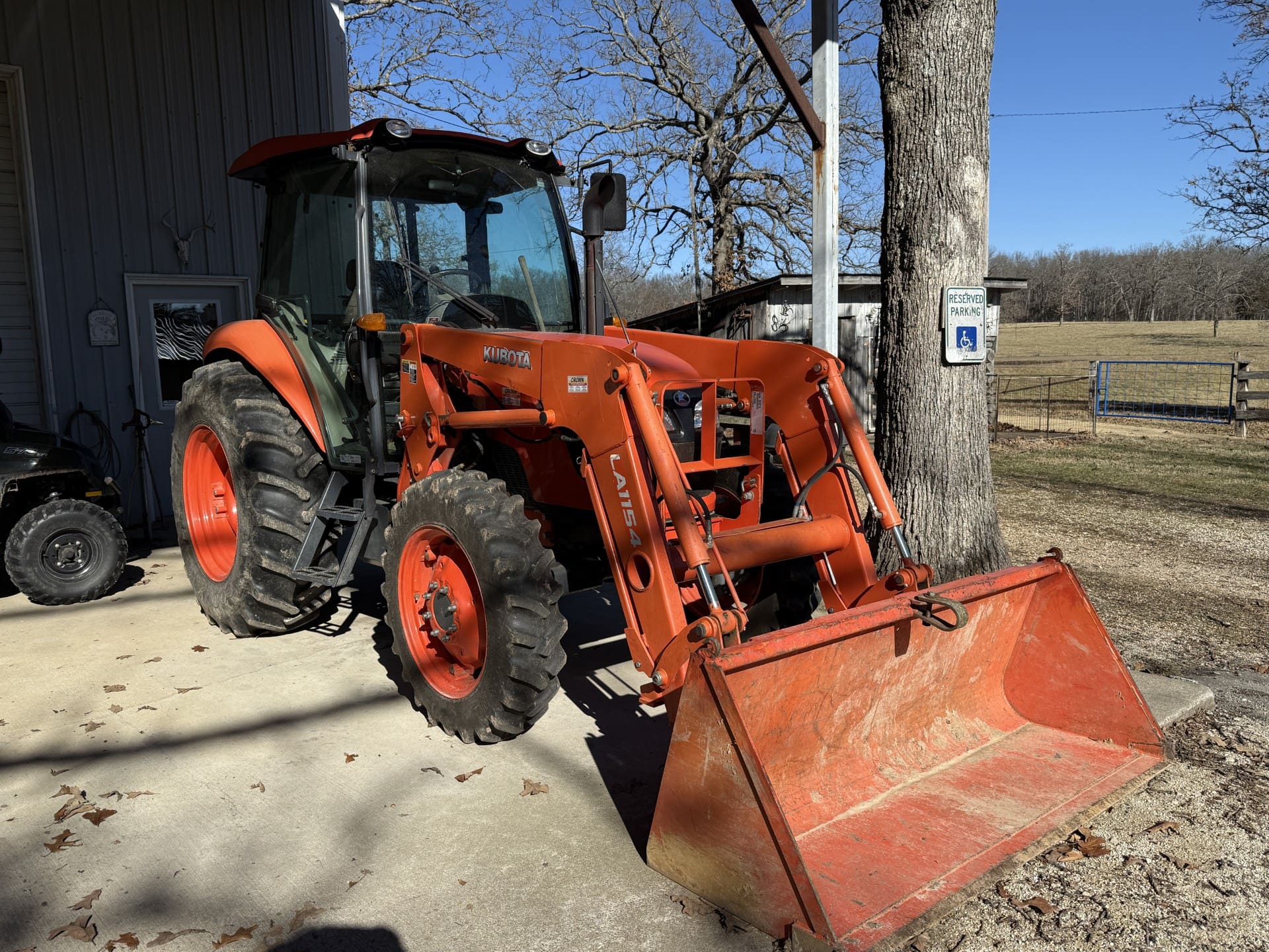 2015 Kubota M7060 tractor, cab, hyd .left hand shuttle shift, 16.9 x 30 rear tires, 9.5 x 24 front tires, 2,480 hours w/ Kubota LA 1154 hyd. frt. loader, wobble stick cab control, hyd. remote , 72” material quick attach bucket